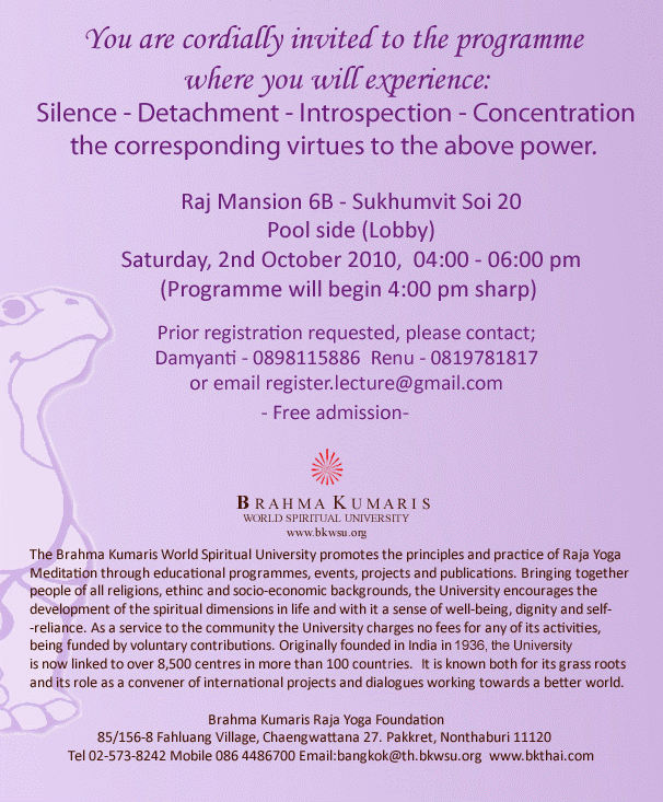 มูลนิธิบราห์มา กุมารี ราชาโยคะ 85/156-8 ม.ฟ้าหลวงวิลเลจ ถ.แจ้งวัฒนะ ซ.27 อ.ปากเกร็ด จ.นนทบุรี 11120 |