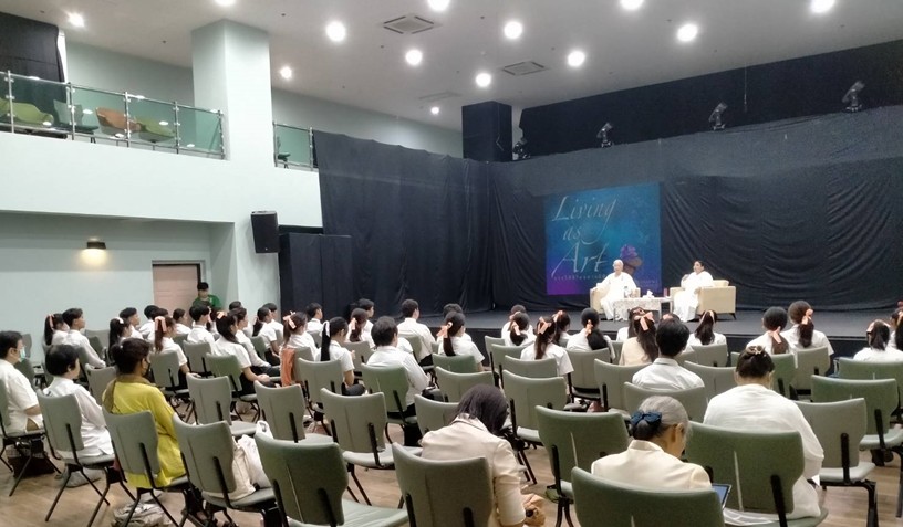 What is living as art? Any normal action that takes on a special degree of attention, expression, finesse and value is an art- a high standard of doing thing. Living becomes art when every thought, word and action is an expression of spiritual fullness. The art of thinking We create our world based on thoughts. This art is about mastering the ability to review your mental creations, and reclaim the power to create high-quality thoughts that are independent of external influences and align with your true self. Spiritual Arts presented by Br.Pom Art and spirituality have some similar processes. That is, when the life of an artist perceives the knowledge of this world into the mind, it will reflect or convey it in a meaningful, valuable and beautiful way, e.g. in songs through musical melodies, some write poetry,literature , Some create canvas paintings, others perform dances on stage. What they do is to create beauty in a variety of ways. Each of us is an artist who can create value or convey beauty from within. Some of our words and deeds are sweet, some are brave, some are strong, and some are honest if we look at the world as having a lot of hidden values if we believe that everyone has good intrintic qualities in both art and spirit, it may become a tool to reveal beauty,to enrich both ourselves and the world to be beautiful and livable for a long time. Experience Shared by Sr.Pum (co-ordinator) The invaluable experience gained from the heart-opening of the much-respected teachers at the National Institute of Development Arts Sr.Gopi Patel shared the spriritual knowledge with first-year students by introducing 2 arts of life “patience and tolerance” with which we can always win and find success. * Stop expecting, Spend time in a worthwhile way , understand everything in life... ...wait for the right rhythm to change and grow. Wait and see... (click) Om Shanti