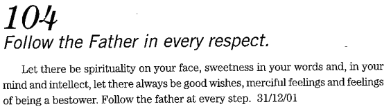 104.ทำตามพ่อในทุกๆ ด้าน ขอให้มีความผ่องแผ่วทางจิตอยู่บนใบหน้าของลูก ความหวานอยู่ในคำพูดของลูกและในจิตใจและสติปัญญาของลูก ขอให้มีแต่ความปรารถนาดี ความรู้สึกที่เมตตาและความรู้สึกของการเป็นผู้ให้ ทำตามพ่อในทุกย่างก้าว 31/12/01