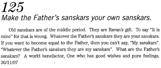 สันสการ์เก่านั้นเป็นเรื่องของยุคกลาง เป็นของขวัญจากราวัน การพูดว่า "นี่เป็นของฉัน" นั้นผิด ไม่ว่าสันสการ์อะไรของพ่อก็เป็นสันสการ์ของลูก หากลูกต้องการทัดเทียมพ่อ ลูกก็ไม่อาจพูดว่า "สันสการ์ของฉัน" "ไม่ว่าสันสการ์อะไรของพ่อก็เป็นสันสการ์ของฉัน" แล้วสันสการ์ของพ่อคืออะไร? คือผู้ให้คุณประโยชน์โลก ผู้มีความปรารถนาดีและความรู้สึกที่บริสุทธิ์ 30/11/07