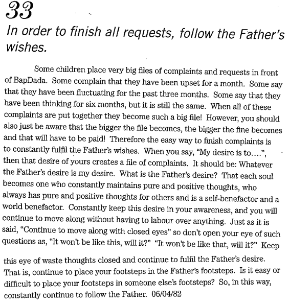 ลูกบางคนวางแฟ้มคำร้องและร้องขอกองใหญ่ไว้หน้าบัพดาดา คำร้องที่พวกเขาไม่พอใจมาเป็นเดือน บ้างก็ว่าพวกเขาไหวหวั่นมาตั้งสามเดือนก่อนนี้ บ้างก็ว่าเขาคิดไว้ถึง 6 เดือนแต่ก็เหมือนเดิม เมื่อรวมคำร้องเหล่านี้ไว้ด้วยกันก็เป็นกองใหญ่อย่างไรก็ตามลูกก็ควรเพียงตระหนักว่ายิ่งแฟ้ม(file)ใหญ่ขึ้น ก็ต้องเสียค่าปรับ(fine)มากเท่านั้น ดังนั้นวิธีง่ายๆที่จะจบสิ้นคำร้องคือเฝ้าแต่ทำตามที่พ่อปรารถนา เมื่อลูกพูดว่า "ลูกอยาก...." แล้วความอยากนั้นก็สร้างแฟ้มคำร้องขึ้น ควรเป็นว่า ไม่ว่าอะไรคือความอยากของพ่อก็คือความอยากของฉัน พ่ออยากอะไร? อยากให้แต่ละดวงวิญญาณกลายเป็นผู้รักษาความคิดที่บริสุทธิ์และเป็นบวก เป็นผู้ที่มีความคิดบริสุทธิ์และบวกเสมอสำหรับผู้อื่น และเป็นผู้ให้คุณประโยชน์ตนและประโยชน์โลก จงเฝ้ารักษาความอยากนี้ไว้ในสำนึกรู้ของลูกแล้วลูกก็จะก้าวไปโดยไม่ต้องลำบากกับอะไร เช่นที่กล่าวว่า "หลับตาก้าวไป" ดังนั้นอย่าเปิดตาให้คำถามที่ว่า " มันไม่เป็นอย่างนี้ ใช่ไหม? " "มันไม่เป็นอย่างนั้น ใช่ไหม? " จงปิดตาของความคิดไร้สาระนี้และเฝ้าแต่เติมเต็มความอยากของพ่อ นั่นคือเฝ้าวางเท้าบนรอยเท้าของพ่อ สิ่งนั้นง่ายหรือยากที่จะวางเท้าในรอยเท้าผู้อื่น ? ดังนั้นด้วยวิธีนี้จงเฝ้าเดินตามพ่อ 06/04/82