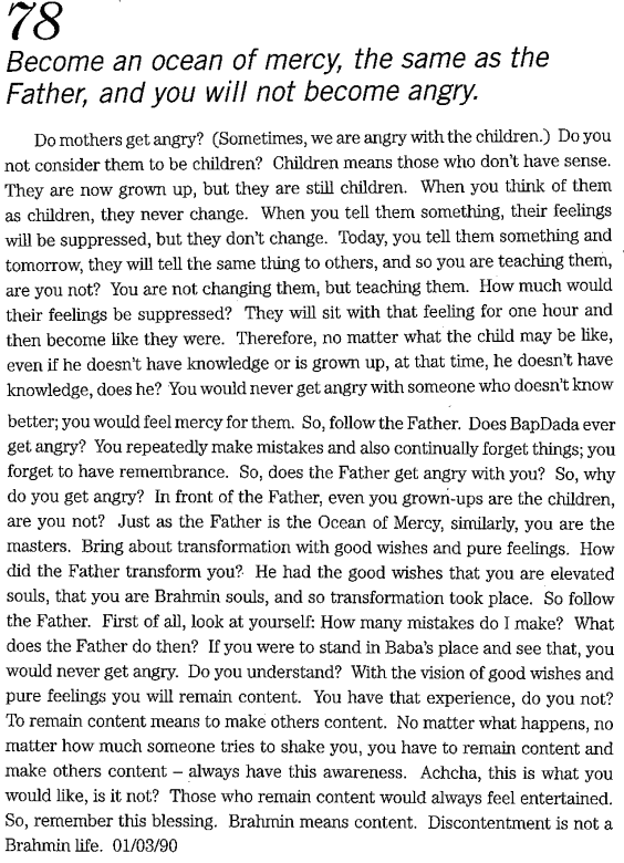 ผู้เป็นแม่มีความโกรธไหม? (บางครั้งเราก็โกรธลูกๆ) ลูกไม่คิดว่าพวกเขาคือเด็กหรือ? เด็กคือผู้ที่ยังไม่มีสำนึก แม้ว่าพวกเขาเติบโตขึ้น เขาก็ยังเป็นเด็ก เมื่อลูกคิดว่าพวกเขาคือเด็ก พวกเขาก็ไม่เคยเปลี่ยน เมื่อลูกบอกอะไรบางอย่างแก่เขา ความรู้สึกของเขาจะถูกกดดันแต่พวกเขาก็ไม่เปลี่ยน วันนี้ลูกบอกเขาอย่างหนึ่ง แล้วพรุ่งนี้เขาก็บอกสิ่งเดียวกันนั้นกับผู้อื่น แบบนี้ลูกก็ได้สอนเขา ใช่ไหม? ลูกไม่ได้เปลี่ยนเขา แต่สอนเขา ความรู้สึกของเขาจะถูกกดดันเพียงใด? พวกเขาจะนั่งอยู่กับความรู้สึกนั้นสักหนึ่งชั่วโมง แล้วเขาก็กลับเป็นเหมือนเดิม ดังนั้นไม่ว่าเด็กจะเป็นอย่างไร แม้ว่าเขาจะไม่มีความรู้หรือเติบโตขึ้น ในเวลานั้น เขาไม่มีความรู้ ใช่ไหม? ลูกจะไม่โกรธคนที่เขาไม่รู้ดีกว่า ลูกจะรู้สึกเมตตาพวกเขา ดังนั้นจงทำตามพ่อ บัพดาดาเคยโกรธไหม? ลูกเฝ้าแต่ทำผิดและลืมสิ่งต่างๆด้วย ลูกลืมที่จะมีการจดจำระลึกถึง ดังนี้ แล้วพ่อโกรธลูกหรือไม่? ดังนั้นเหตุใดลูกจึงโกรธ? ต่อหน้าพ่อ แม้ลูกที่โตแล้วก็เป็นเด็ก ใช่ไหม? เช่นที่พ่อคือมหาสมุทรแห่งความเมตตา เช่นเดียวกันนั้นลูกก็เป็นนาย จงให้การเปลี่ยนแปลงด้วยความปรารถนาดีและความรู้สึกที่บริสุทธิ์ พ่อเปลี่ยนลูกอย่างไร? ท่านมีความปรารถนาดีที่ว่าลูกนั้นคือดวงวิญญาณสูงส่ง เป็นดวงวิญญาณบราห์มิน แล้วการเปลี่ยนแปลงก็เกิดขึ้น ดังนั้นจงทำตามพ่อ ประการแรก มองดูตัวเอง ฉันทำสิ่งผิดมากเพียงใด? แล้วพ่อทำอย่างไร? หากลูกมาเป็นพ่อแล้วมองดู ลูกก็จะไม่โกรธ ลูกเข้าใจไหม? ด้วยสายตาของความปรารถนาดีและความรู้สึกที่บริสุทธิ์ลูกจะอยู่อย่างพอใจ ลูกมีประสบการณ์อย่างนั้น ใช่ไหม? การคงอยู่อย่างพอใจคือการทำให้ผู้อื่นพอใจ ไม่ว่าอะไรเกิดขึ้น ไม่ว่ามีใครทำให้ลูกสั่นไหวเพียงใด ลูกต้องอยู่อย่างพอใจและทำให้ผู้อื่นพอใจ จงมีสำนึกแบบนี้เสมอ อัชชา นี่คือสิ่งที่ลูกชอบ ใช่ไหม? ผู้ที่คงอยู่อย่างพอใจจะรู้สึกสนุก ดังนั้นจงจดจำพรนี้ บราห์มินหมายถึงความพอใจ ความไม่พอใจไม่ใช่ชีวิตบราห์มิน 01/03/90