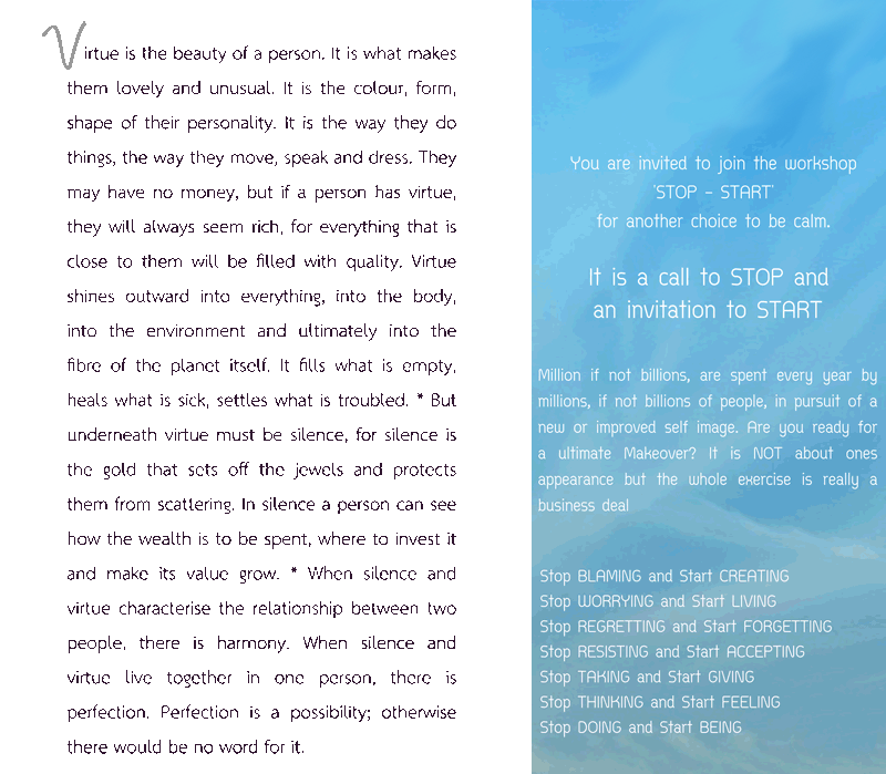 Thanks for original idea from 'Clear Thinking' article…to help us to find another way to 'choose to be calm' by conducting the workshop on 'Stop-Start' at 3-4pm. for 2 groups.