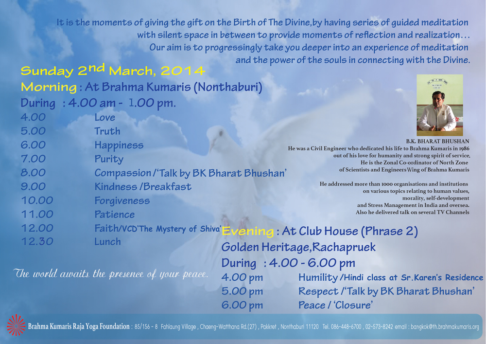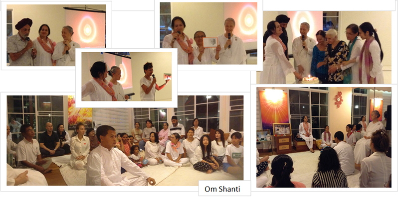On 31 January 2014, through a live transmission the whole world was awaken to listen to His direction to be able to take into actions…for a sake of liberation! With courage of the children,the Father helps! Sr.Karen (Amarjit Kaur Doowa) send Sr.La a message during live transmission at different corner of Bangkok Metropolitan area. Supreme Direction from live transmission through which our Celebration of Love was arranged on Saturday 15 Febuary at the Club House of Golden Heritage residential area. You, your friends and family are most welcome to the Moments of giving gift by Peacemaker on… Sunday 2 March,2014 at the same Club House, Golden Heritage, Rachapruek. A sweet reflection from Sr.Karen "I received a strong message from God on Jan 31st eve, to do something in "my area" for World Renewal, for spreading Peace and Love.. and I immediately and impulsively acted upon it, by emailing Sr. La, Head of Brahma Kumaris Thailand, and my dear senior spiritual sister, to help me do a program, here in 'Golden Heritage' my home area, in this month of Love (February), as my birthday is also in this month. Magically everything happened after that. Her response, Brother Anil's announcement in Murli class on Feb 8, my calling and rushing over to meet Sr La that very day, all of them coming over to take a look at my house area, a meeting of the residents of the moobaan(complex) taking place that very evening, and within a week, we were all gathered beautifully..spreading virtues..on Saturday evening, Feb 15. The whole place looked angelic, with soft fabric streamers, and red hearts as decor, and the coordinators wearing white with peach scarves and pink rosesa It was such a beautiful vision. We welcomed all the friends into playing "Virtuescope", while live singing took place (we sang an Indian song too).. and snacks were laid out creating an enticing picnic ambience. Everyone loved and benefitted from the game. We all then went inside the spacious and decorated Club House, for a moment of silence, followed by an introduction to the 5 core virtues through video clips, PowerPoint, and sharings by 5 of us. The magical moment of the day was when colored balloons and rose petals were showered on everyone seated..it was such a blissful sight! Everyone was so happy and peaceful. Many people also got the chance to share virtues reflections, based on picture cards that had been distributed earlier to them, giving their personal thoughts about it. I was then surprised by cake cutting in celebration of my birthday. My husband and all 3 mothers were present to share this lovely moment - My mother, my mother in law, and Sr La our Thailand Bk mother. We then proceeded in silence with soft Baba's song playing sweetly, as we walked over to Baba's home, blessed by the name "Guru Kripa"..and had a very sweet time of silent evening yog. It was very empowering as many felt and expressed the energy around. I sang the song of the day as it turned out..Yeh Dosti him nahi torengey ( This Friendship I will never break..), a very popular Hindi song. Everyone got blessing cards and Toli too. An amazingly beautiful soft sweet day filled with lightness and love. Everything happened by itself, we just floated along.. Thank you Baba so much. Love you." ![]() ![]() ![]() ![]() R.S.V.P. 086-448-6700 |
