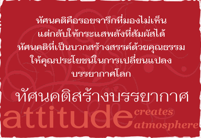 ![]() "เมื่อเรามีทัศนคติเดียวกัน เมื่อนั้นโลกจะเปลี่ยน" เพียงแต่มีความคิดสำหรับงานรับใช้โลก มีคำพูดเพื่อให้คุณประโยชน์โลก และให้การกระทำเป็นไปเพื่อเปลี่ยนแปลงโลก ขอเชิญร่วมกระจายแสงสว่างของทัศนคติที่ให้คุณประโยชน์โลก วันอังคารที่ 5 พฤษภาคม 2558 เวลา 10.00 - 12.00 น. ณ มูลนิธิ บราห์มา กุมารี ราชาโยคะ (สำหรับผู้ที่จบบทเรียนราชาโยคะแล้วพบกันในเวลาอมฤตและเมอร์ลี) เราตระหนักรู้จักตนเองในสภาพดั้งเดิมที่เราเคยเป็น เราคือผลผลิตที่บริสุทธิ์ของธรรมชาติที่เป็นแสงแห่งสัจจะ เมื่อเราเห็นความงามในจิตใจ เราก็พร้อมที่จะโปรยทัศนคติเช่นนั้นออกไปสู่โลก ด้วยความคิด คำพูด การกระทำ สายตา ที่มีแต่ความปรารถนาดี ดังนั้นเราจึงสามารถเปลี่ยนสถานที่ที่เราอยู่ ทุกที่ที่เราย่างก้าวไป ให้เต็มไปด้วยบรรยากาศของความสงบ ความรัก และความสุข จากการหยิบยื่นรอยยิ้มให้แก่กัน การพูดจาด้วยความอ่อนหวานและท่าทีที่อ่อนโยนต่อกัน