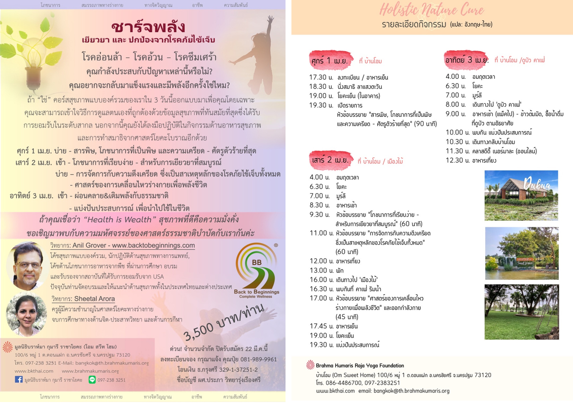 สรุปสาระของการบรรยาย ในส่วนแรกบราเตอร์พูดถึงสารพิษที่มีแทรกซึมอยู่ในสินค้าอุปโภคบริโภคที่เราใช้ในชีวิตประจำวันอย่างหลีกเลี่ยงไม่ได้ ซึ่งทำลายเซลล์, ส่วนของโภชนาการสารอาหาร บราเตอร์แนะนำอาหารที่เราควรเลือกรับประทานและอาหารที่ควรหลีกเลี่ยง รวมถึงการล้างสารพิษ เช่น การอดอาหาร เป็นสิ่งจำเป็น, สุดท้ายคือความเครียด ซึ่งเป็นตัวการสำคัญที่สุด ถึงแม้ว่าเราจะปรับเปลี่ยนชีวิตอย่างดี รับประทานอาหารที่ดี นอนหลับพักผ่อนอย่างเพียงพอ แต่ตราบใดที่ยังมีความเครียดสูง ก็เท่ากับเป็นการปิดสวิตซ์ของการมีสุขภาพดีเลยทีเดียว...ปัจจัยทั้งหมดนั้นมีผลต่อฮอร์โมนต่างๆในร่างกาย หากเราดูแลร่างกายไม่ถูกต้อง ฮอร์โมนก็จะทำหน้าที่ผิดปกติ ส่งผลให้เกิดอาการอ่อนล้า เหนื่อยง่าย โรคอ้วน และโรคซึมเศร้าได้....และการแก้ไขที่สำคัญที่สุด คือ การฝึกจิตทำสมาธิแบบราชาโยคะ จะช่วยเข้าไปแก้ไขจิตสำนึก ให้ตระหนักรู้จักตนเองได้อย่างถูกต้อง เพราะเราทำกรรมบนพื้นฐานของสำนึกที่ว่าเราแท้จริงนั้นเป็นใคร ไม่ใช่เพียงสิ่งห่อหุ้มภายนอก เราจะสามารถตอบรับต่อทุกสถานการณ์ได้อย่างเป็นบวก โดยอาศัยความรู้ของราชาโยคะและการเชื่อมโยงเพื่อรับพลังจากสิ่งสูงสุด นอกจากนี้ Sr.Sheetal ยังสอนท่าออกกำลังกายง่ายๆ ที่ทำได้บ่อย แม้มีเวลาน้อย และสอนการหายใจแบบ Box breathing รายละเอียดเนื้อหาในการบรรยายดูใน video