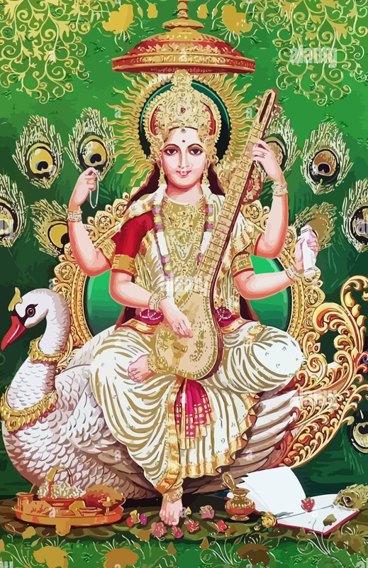 Goddess Saraswati - spiritual white swan พระนางสรัสวดี มีหงส์เป็นพาหนะ มีเครื่องดนตรีบรรเลงเพลงสวรรค์แห่งภควัน (Gita) |