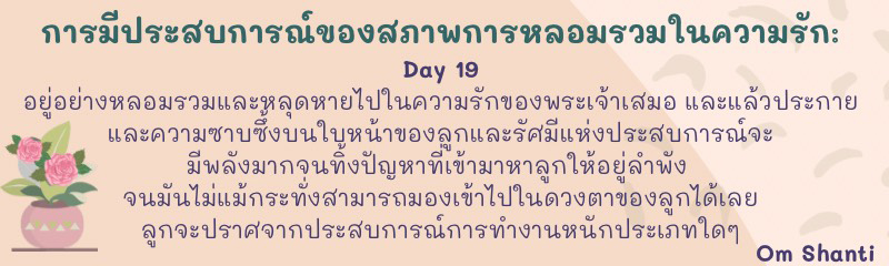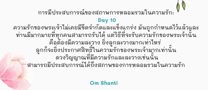 อยู่อย่างหลอมรวมและหลุดหายไปในความรักของพระเจ้าเสมอ และแล้วประกายและความซาบซึ้งบนใบหน้าของลูกและรัศมีแห่งประสบการณ์จะมีพลังมากจนทิ้งปัญหาที่เข้ามาหาลูกให้อยู่ลำพัง จนมันไม่แม้กระทั่งสามารถมองเข้าไปในดวงตาของลูกได้เลย ลูกจะไม่มีประสบการณ์การทำงานหนักประเภทใดๆ