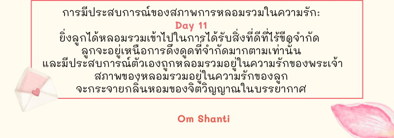 มากเท่าที่ลูกหลอมรวมเข้าไปในการได้มาซึ่งการบรรลุผลที่ไม่มีขีดจำกัด ลูกจะอยู่เหนือการดึงดูดที่จำกัดมากตามนั้น และมีประสบการณ์ตัวเองถูกหลอมรวมอยู่ในความรักของพระเจ้า สภาพของการถูกหลอมรวมอยู่ในความรักของลูกจะกระจายกลิ่นหอมของจิตวิญญาณไปในบรรยากาศ