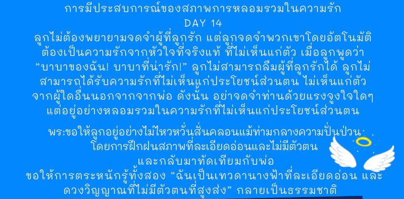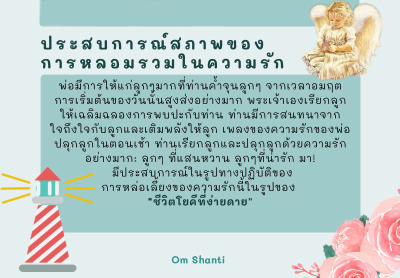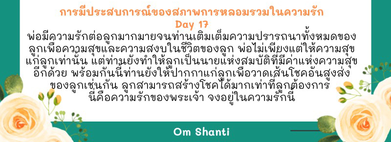 พ่อมีความรักต่อลูกมากมายจนท่านเติมเต็มความปรารถนาทั้งหมดของลูกเพื่อความสุขและความสงบในชีวิตของลูก พ่อไม่เพียงแต่ให้ความสุขแก่ลูกเท่านั้น แต่ท่านยังทำให้ลูกเป็นนายแห่งสมบัติที่มีค่าแห่งความสุขอีกด้วย พร้อมกันนี้ท่านยังให้ปากกาแก่ลูกเพื่อวาดเส้นโชคอันสูงส่งของลูกเช่นกัน ลูกสามารถสร้างโชคได้มากเท่าที่ลูกต้องการ นี่คือความรักของพระเจ้า จงอยู่ในความรักนี้