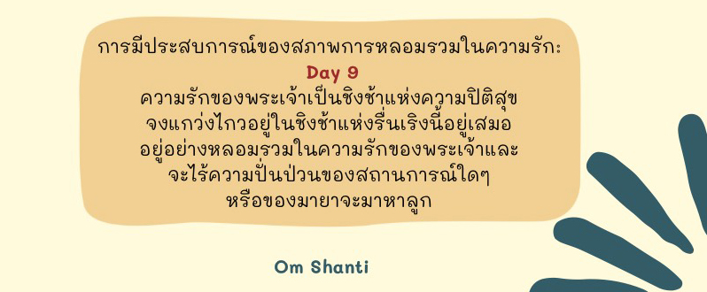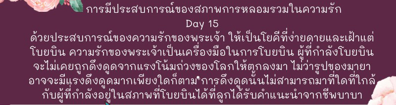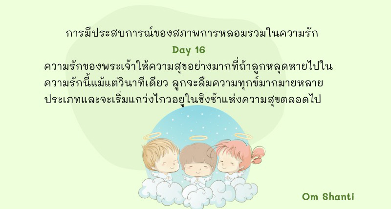 ความรักของพระเจ้าเป็นชิงช้าแห่งความปิติสุข จงแกว่งไกวอยู่ในชิงช้าแห่งความสุขนี้อยู่เสมอ อยู่อย่างหลอมรวมในความรักของพระเจ้าและจะไม่มีความปั่นป่วนของสถานการณ์ใดๆหรือมายาจะเข้ามาหาลูก