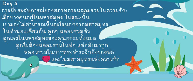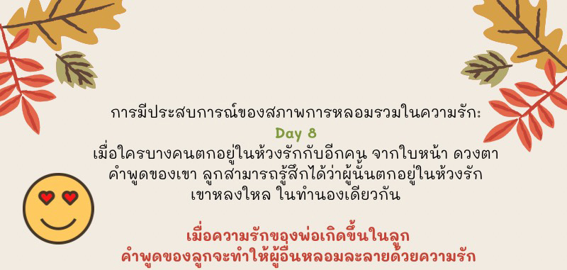 เมื่อใครบางคนอยู่ในห้วงรักกับอีกคน จากใบหน้า ดวงตา คำพูดของเขา ลูกสามารถรู้สึกได้ว่าผู้นั้นอยู่ในห้วงรัก เขาหลงใหล ในทำนองเดียวกัน เมื่อความรักของพ่อเกิดขึ้นในลูก คำพูดของลูกจะทำให้ผู้อื่นหลอมละลายด้วยความรัก