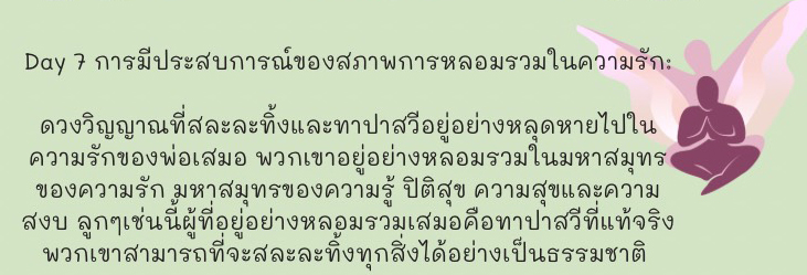 อยู่อย่างไม่เหลือการตระหนักรู้ของร่างกายในลักษณะที่ชีวิตของลูกไม่ขึ้นอยู่กับสำนึกที่เป็นร่างกาย กลางวันและกลางคืน ความหิวหรือความกระหาย ความสุขหรืออุปกรณ์สิ่งอำนวยความสะดวก และแล้วสภาพของลูกก็จะเป็นเช่นการอยู่อย่างหลอมรวมในความรัก เช่นที่เปลวไฟอยู่ในรูปของแสงสว่างและพลัง ในทำนองเดียวกัน ลูกกลายเป็นรูปของแสงและอำนาจ