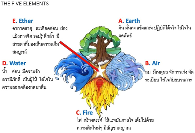 ดิน มั่นคง แข็งแกร่ง ปฏิบัติได้จริง ใส่ใจในผลลัพธ์ น้ำ อ่อนนุ่ม มีความรัก มีความสวามิภักดิ์ ใส่ใจกับความสอดคล้องกลมกลืน ลม มีเหตุผล จัดการเก่ง จัดระเบียบ ใส่ใจกับขบวนการ ไฟ สร้างสรรค์เต็มไปด้วยความคิดให้แรงบันดาลใจ มีสัญชาตญาณ เราทั้งหมดจะมีทั้ง 4 หรืออาจมีในสัดส่วนต่างกัน ตัวอย่างคนที่มีดิน 35% น้ำ 15% คนนั้นจะเป็นคนที่ปฏิบัติได้จริงเป็นคนวางแผนเหมือนกับเป็นรถแทรกเตอร์โดยไม่ใส่ใจว่าอะไรกำลังเกิดขึ้นในความรู้สึกของผู้อื่น ถ้ามี ด้านที่ 5 ซึ่งเป็นอีเทอร์ เป็นด้านทางจิตวิญญาณที่ละเอียดอ่อนที่มาจากความรู้ทางจิต และการเชื่อมโยงกับบาบามาทำให้อุปนิสัยพื้นฐานของเราเป็นไปทางจิตวิญญาณมากขึ้น มิฉะนั้นทางด้านต่ำของเราคือดินที่ก้าวร้าว ที่ต้องการผลลัพธ์ ต้องการให้มีบางสิ่งบางอย่างเกิดขึ้น แต่ไม่ใส่ใจในความสัมพันธ์ เพียงต้องการผลที่เกิดขึ้น คนที่เป็นอากาศจะใส่ใจกับการวางแผนคิดอยู่เบื้องหลังทุกสิ่งเพราะเขาฉลาดมากเขาก็จะหยิ่งยโส ชอบวิพากษ์วิจารณ์ เขารู้ว่าอะไรผิดพลาดไปในกระบวนการ ผู้ที่เต็มไปด้วยความคิดจะมีความคิดเห็นใหม่ๆตัวอย่างเช่นมีความคิดห้าอย่างต่อวัน จะไม่ชอบที่จะอภิปราย ไม่ชอบการประชุม ถูกดึงรั้งง่าย ด้านที่ไม่ดีของน้ำคืออ่อนมากเกินไป ไม่ตัดสินใจ อ่อนไหวมากเกินไป คนที่เป็นน้ำจะร้องไห้มาก แต่ต้องการความสอดคล้องกลมกลืน เขาจะไม่พอใจถ้าหากไม่มีความสอดคล้องกลมกลืน (คลิกอ่านต่อ) The game of the 3 dots เกมของ สามจุด