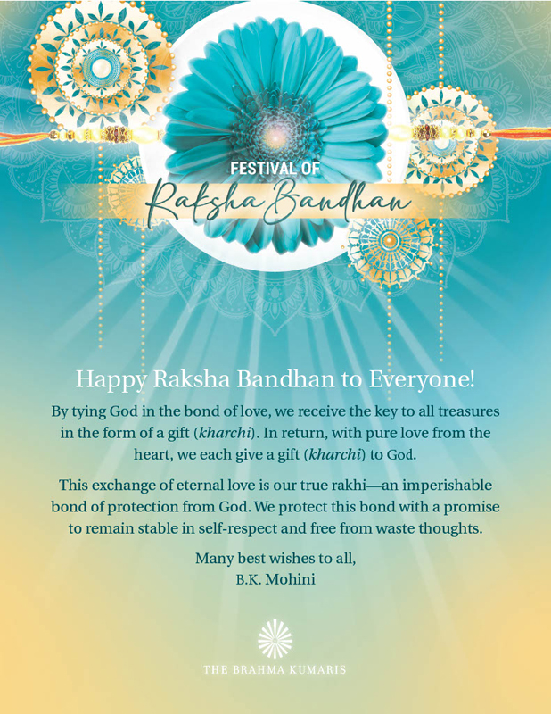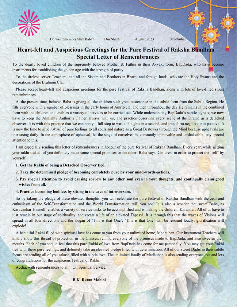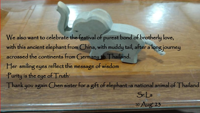 ให้ความสุขแก่ทุกคน ในการฉลองพันธะแห่งรักที่บริสุทธิ์ของพี่น้องครอบครัวชาวโลก ที่มีพระเจ้าปกป้องคุ้มครองให้ปลอดภัยจากสิ่งที่ไร้ประโยชน์ พร้อมทั้งได้รับพรจากซีเนียร์จากมธุบัน(Dadi Rattan Mohoni) จากนิวยอร์ก(Didi Mohini) และจากที่ต่างๆเน้นความสำคัญของ ‘ความบริสุทธิ์’ พี่หล้าถือโอกาส แลกเปลี่ยนของขวัญพิเศษ กับผู้ประสานงานของประเทศจีน โดยมี Sr.Gopi เป็นผู้รับฝากไป-มา