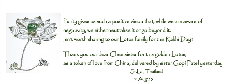 ความบริสุทธิ์ทำให้เรามีสายตาที่เป็นบวก มองโลกในแง่ดี ขณะที่มีสำนึกรู้ในความไม่ดีที่เป็นลบ เราเพียงต้องปรับให้เป็นกลางและอยู่เหนือสิ่งนั้นให้ได้ นี่คือสิ่งที่มีค่าควรแก่การแบ่งปันในครอบครัวดอกบัวของเราในวันรัคกี้นี้มิใช่หรือ? ขอบคุณนะ ซิสเตอร์ เชน ที่รักของเรา สำหรับของขวัญดอกบัวสีทองนี้ ที่สื่อความหมายแห่งรักจากจีน นำมามอบให้โดยซิสเตอร์โกปี้เมื่อวานนี้ Sr.La, ประเทศไทย(30 ส.ค.66)