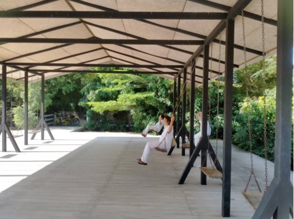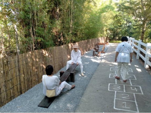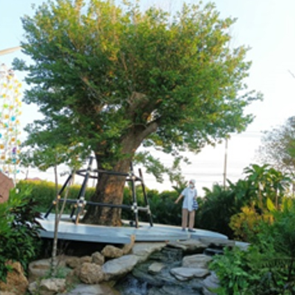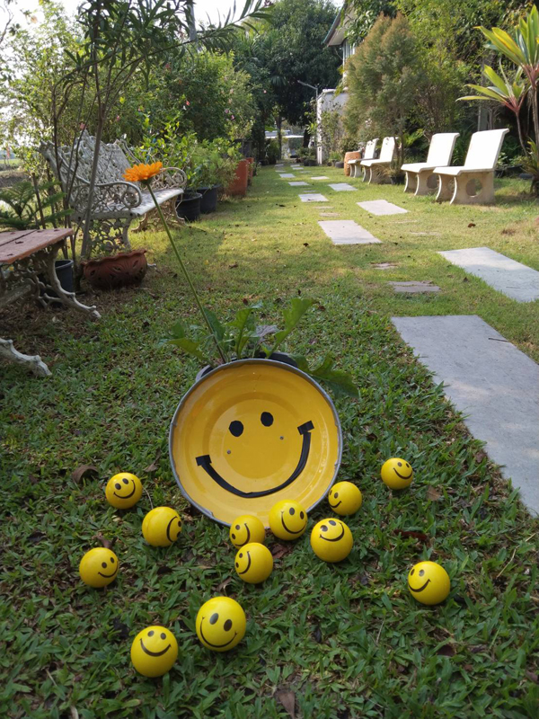 เราเตรียมมุมสีเหลืองไว้ให้ทุกคนยิ้มและหัวเราะกับการปาลูกบอลลงถังสีเหลือง...ใต้ต้นไม้ ด่านแรกที่มี Joy-ความสุขสันต์ คอยต้อนรับ และให้รางวัล