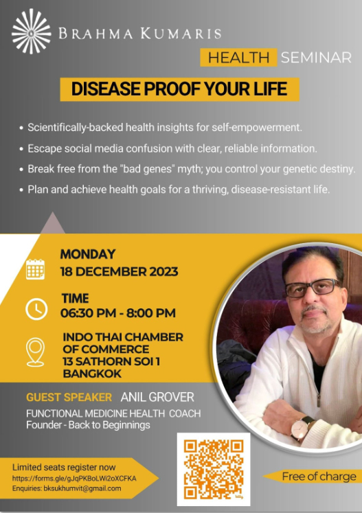 18 ธ.ค. Sr.Shivani แนะนำให้ครอบครัวสุขุมวิท จัดสัมนา 'สุขภาพ' Health Seminar ให้ Br.Anil พูด 'Disease Proof Your Life' เป็นการหล่อเลี้ยงสมาชิก