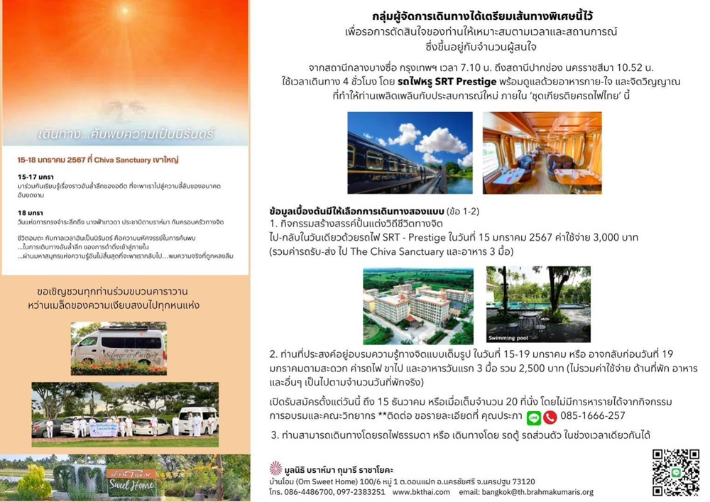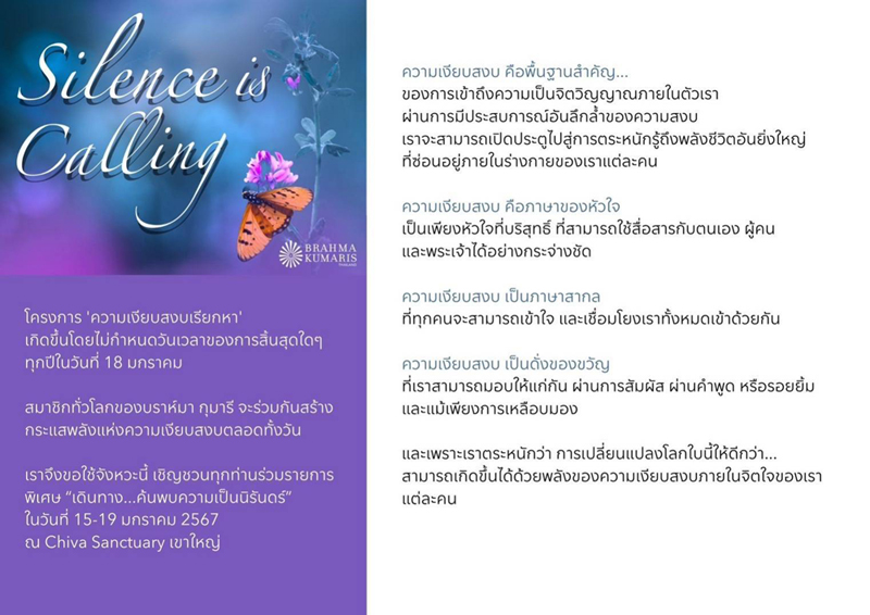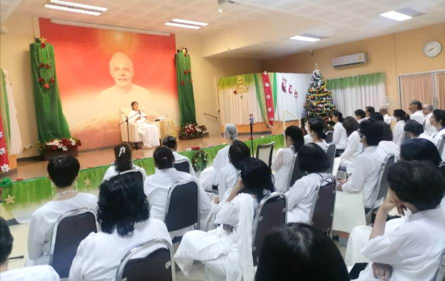 หลังมอบของขวัญ Sr.La ได้แนะนำเกี่ยวกับโครงการ Silence In December, we are being prepared for a January of transformation through experimenting in silence to build momentum and deepen our commitment to making full effort in January 2024, the month of Silence. The basis for individual experiments worldwide is going beyond staying beyond In Thailand, we have been focusing on the project ‘Silence is Calling’ since September which has no end. Silence is fundamental principle to get into spirituality within. Silence can open the door of our great life force hidden inside each one of us. Silence is a language of a pure heart that we can communicate with the self, others and God. Silence is universal language to connect all of us to offer a gift through touch, words or smile. This is why we would like to create a better world through silence. 7 ธ.ค. (ช่วงเช้า) ณ บ้านพินทุ Sr.Shivani ให้มูร์ลีและคลาส สำหรับครอบครัวทางจิต หลังอาหารเช้า