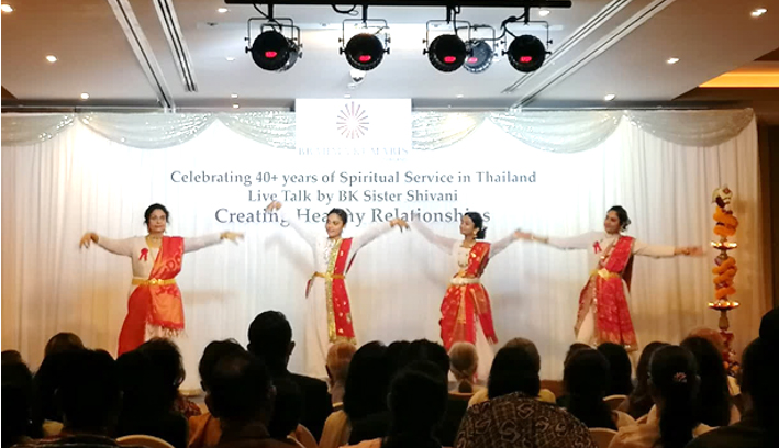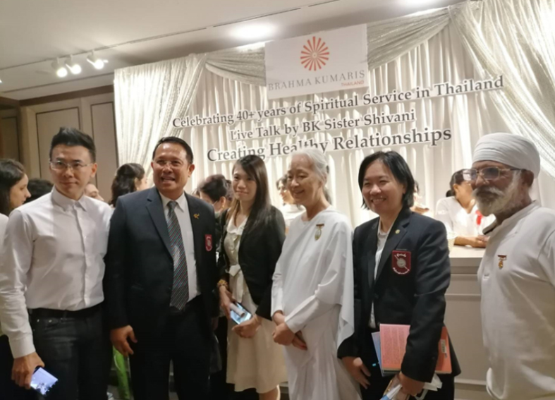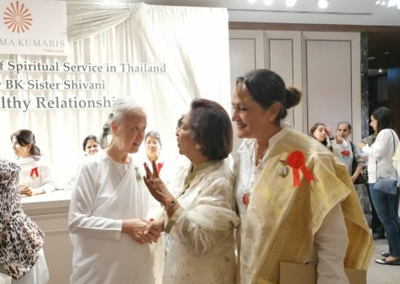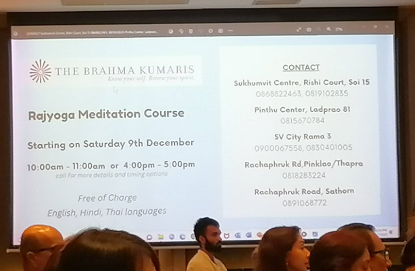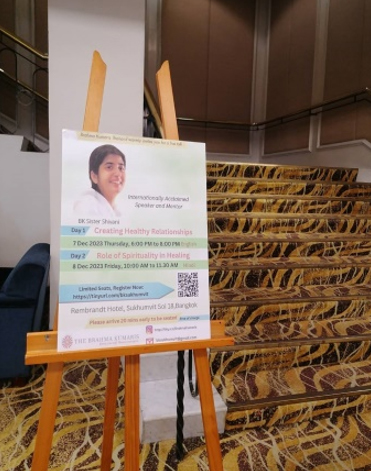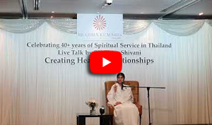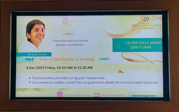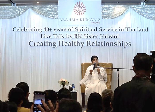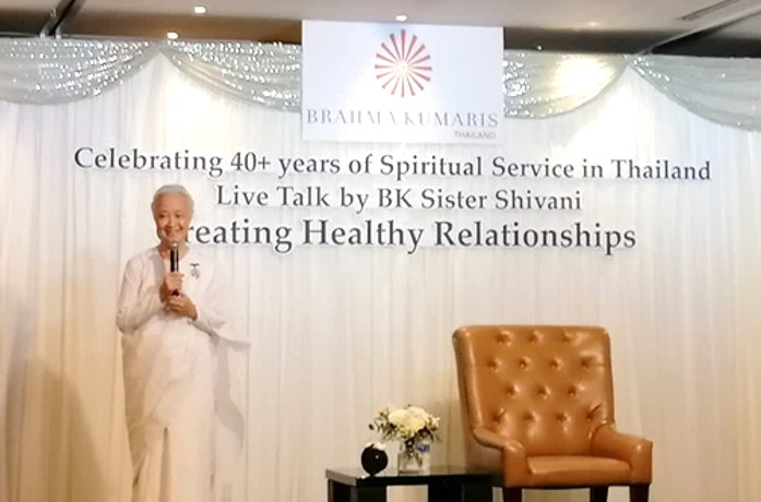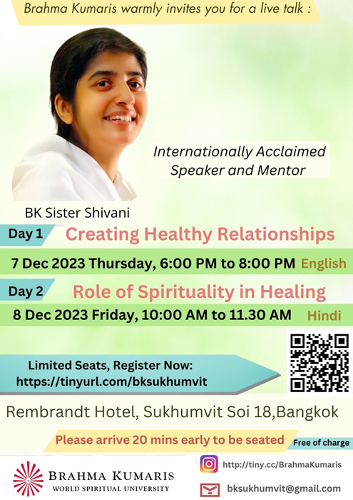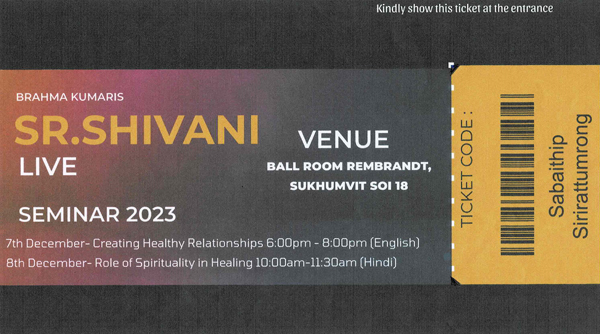 7 ธ.ค. (ช่วงเย็น) ณ โรงแรม Rambrandt Sr.Shivani บรรยายหัวข้อ Creating Healthy Relationships การเชิญ Sr.Shivani ผู้โด่งดัง กึกก้องไปทั่วโลก มาประเทศไทยครั้งนี้ ด้วยดำริของครอบครัวสุขุมวิท เพื่อฉลองการครบรอบ 40 ปี ของบราห์มา กุมารี ในประเทศไทย (โดยมี Sr.La เป็นผู้นำในการประสานงานมาตั้งแต่ปี ค.ศ. 1986) คณะทำงานบ้านสุขุมวิทได้จัดเตรียมทุกสิ่งให้พร้อมด้วยหัวใจ ไม่ว่าจะเป็นการโฆษณาประชาสัมพันธ์ การทำป้ายบนเวทีและการจัดห้องพักในโรงแรม(ที่จัดรายการ) สำหรับ Sr.Shivani และ Sr.La เป็นพิเศษ