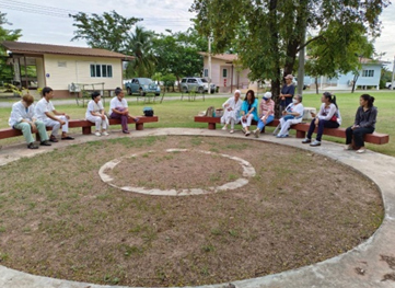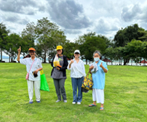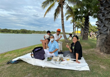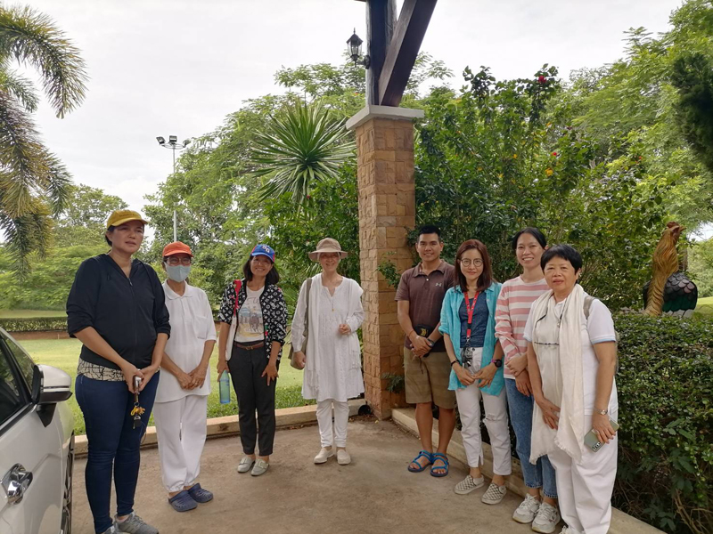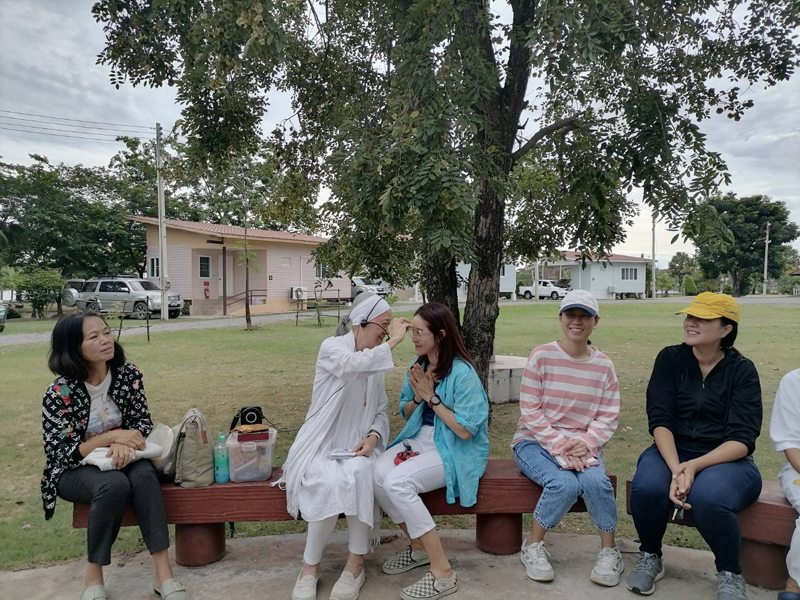 ทีมงานแวะพักรับประทานอาหารระหว่างเดินทาง กับบรรยากาศที่เขียวสดใส ด้วยหัวใจที่เบิกบานของทีมงานที่แข็งขันในการสนองนโยบาย โยกย้ายที่ทำการใหม่ในอนาคต สำหรับงานรับใช้ของบาบา เพื่อสร้างโลกใหม่ที่สวยงาม