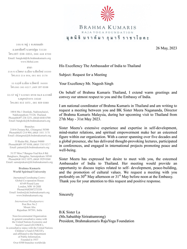 Br.Kailash ผู้ประสานงานบ้านสุขุมวิทได้แจ้งมา พี่หล้าทำหน้าที่ส่ง จ.ม สำหรับ Sr.Meera ไปพบกับทูตอินเดียประจำประเทศไทยตามที่ Sr.Meera ได้ขอมา Sr. Meera is coming to Sukhumvit on 26th May for Hindi retreat from 26-28th May. She is going back on 31st May afternoon. She wish to visit your center and Sr. Jyoti’s center on 29-30th May. She need not to stay at Pinthu. If it is not convenient to visit, she can be informed accordingly. Om Shanti Sr. La.