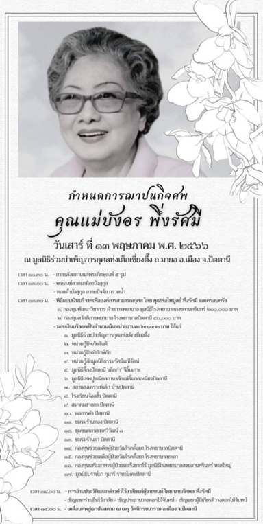 11 พ.ค คุณแม่บังอร พึ่งรัศมี (คุณแม่ของพี่ทิม-ผู้ประสานงานศูนย์ปัตตานี) พี่ทิม คือดวงวิญญาณแรก ที่ได้เข้ามาใช้ชีวิตในศูนย์ราชาโยคะที่กรุงเทพฯ หลังการรณรงค์โครงการ ล้านนาทีแห่งสันติ (ค.ศ 1986) ‘หมะ’ (แม่บังอร พึ่งรัศมี) ผู้เป็นมารดา ได้มาเยี่ยมเยือนเราจากจังหวัดปัตตานี พร้อมน้องๆ(หมอเพชร, หมอเต็ม) พี่หล้าได้ส่งข้อความถึงพี่ทิม ทันที่ที่ทราบข่าว ขอให้ 'หมะ' ของเรากลายเป็นนกที่โบยบิน ข้ามพ้นกำแพงที่มีขีดจำกัดทั้งปวง ไปอยู่เหนือทุกสิ่งเพื่อเข้าไปใกล้จุดหมายปลายทางอย่างที่บาบาให้พรแก่ลูกๆทั้งโลกนะคะ พร้อมนี้คือ การบันทึกเสียง (คลิกฟังเสียง) ในวันพฤหัสก่อนที่เราบ้านโอมจะ Offer Bhog ให้บาบาส่งพลังความรักแก่ หมะและครอบครัว พึ่งรัศมี เพื่อรอจนถึงวันนี้ที่ทำพิธีสุดท้าย บาบาให้เราแบ่งปันประเด็นมูร์ลีในวันที่ 11 พ.ค นั้นด้วยคะ ขอขอบคุณสำหรับการประมวลคุณความดีของหมะไว้ใน E-Book อย่างสวยงาม ซึ่งได้บันทึกไว้ในหัวใจของเราด้วยคะตั้งแต่แรกพบ