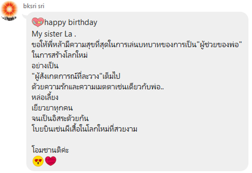 ....พี่หล้าขออวยพรวันเกิดทางจิตของพี่ทิมในวันที่ 17 พ.ย. นี้ด้วยภาพในหัวใจที่พี่ทิมและน้องอุ๋ยจากเหนือ-ใต้ร่วมสร้างผลงานอันทรงเกียรติให้บาบาเสมอมา พี่รับรู้และเป็นพยานตลอดเวลาและตลอดไปนะคะ