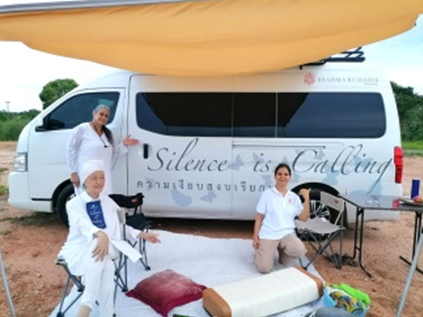 Motor Home arrived at 5.30 pm. on time for group photo with working team in the new T-shirt before embarking on her tour for silence.