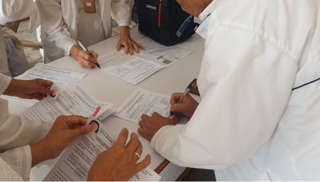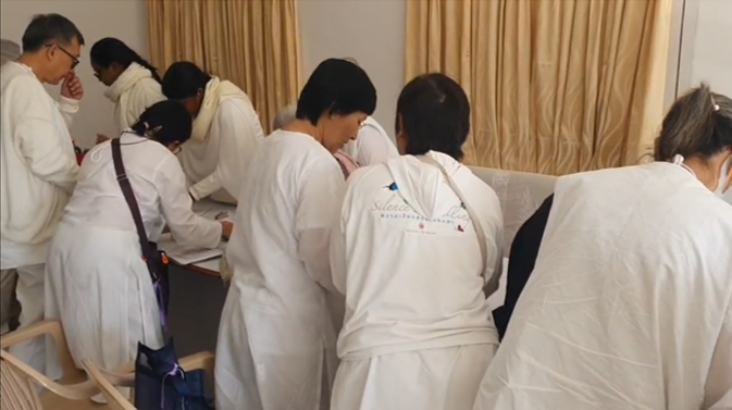 หลังชั้นเรียนมูร์ลี เราร่ำลาผู้ที่กำลังจะเดินทางไปมธุบันด้วยกันทั้งหมด 15 ท่าน จากศูนย์นครปฐม และศูนย์เชียงใหม่ ด้วยการมอบของขวัญจากมธุบันก่อนล่วงหน้า