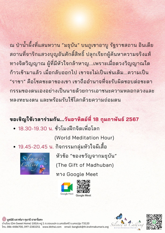 เราได้จัดรายการ on line หัวข้อ ‘มธุบัน’ ในห้องสัมมนา 1 ผ่าน Google Meet กับพี่น้องในประเทศไทย 19 ก.พ. หลังเรียนมูร์ลี เรามีโอกาสได้พบ Didi Sudesh ที่ห้องพัก เพื่อมอบเงินให้ยักย่าจากประเทศไทย ได้พบ Br.Surya Senior ผู้บรรยายหลัก ซึ่งบอกว่ารักประเทศไทย (ในช่วงที่รอ Didi เจิมรถสีแดงคันใหม่)