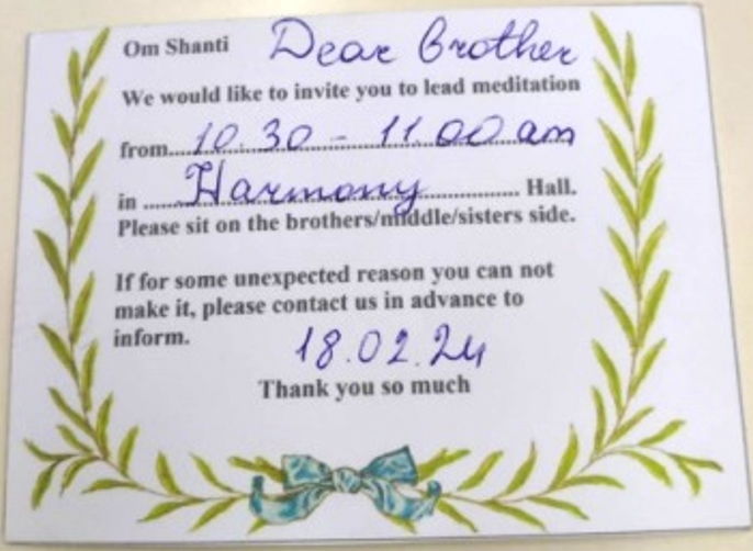 18 ก.พ. ความรู้สึกมหัศจรรย์เกิดขึ้นเมื่อ ขณะที่กำลังรับประทานอาหารเช้าอยู่ Sr.La เดินมาพร้อมกับบัตรเชิญนี้ พร้อมทั้งชี้แจงว่าขอให้เป็นตัวแทนพี่น้องชายจากประเทศไทย ตามเกณฑ์ที่อายุในญาณถึง 5 ปี ขึ้นนั่งนำโยคะฝั่งชายตามเวลาและสถานที่ที่ระบุในบัตรเชิญด้านล่างนี้ ตนเองตอบตกลงทันทีในความรู้สึกที่สงบ ขณะเดียวกันก็มหัศจรรย์ใจและขอบคุณบาบาที่มอบโอกาสนี้ให้ลูกได้ฝึกฝนจิตใจ และได้รับประสบการณ์ที่มีค่าอย่างยิ่ง จากการสัมผัสถึงพลังความรักของบาบา ที่ทำให้รู้สึกว่า เมื่อเรามีความกล้าหาญที่จะทำทุกสิ่งตามหนทางที่ท่านกำหนด งานนั้นก็จะมีความสำเร็จ ให้เราปล่อยวางจากสำนึกของ ‘ฉัน’ หรือ ‘ของฉัน’ และเพียงเราอยู่ในสำนึกที่เป็นเพียงเครื่องมือของท่านเท่านั้น