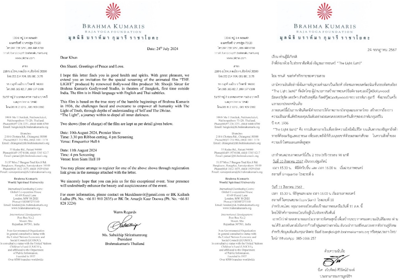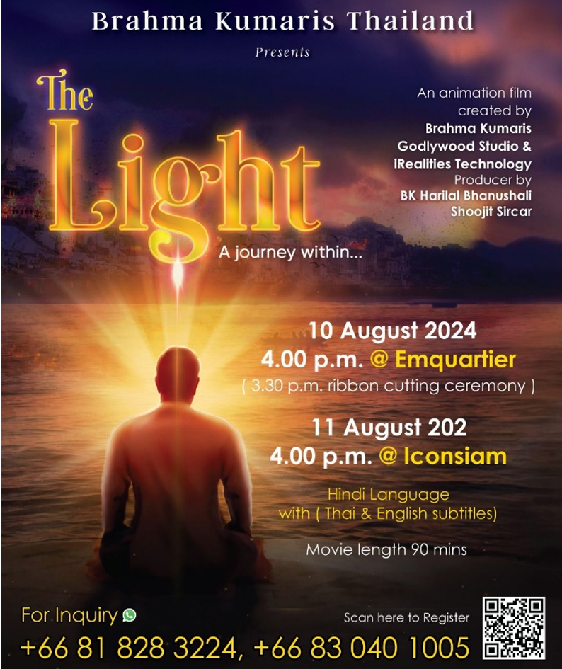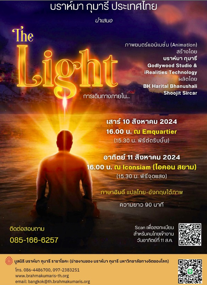 ‘The Light’ มาฉายในประเทศไทยเป็นแห่งแรก ก่อนฉายเป็นทางการรอบปฐมทัศน์ในวันชาติอินเดีย เดือนสิงหาคม แท้จริงแล้วการประกาศอิสรภาพภายในไม่ขึ้นอยู่กับการตกเป็นเมืองขึ้นหรือใครปกครองใคร หากเราเรียนรู้ที่จะปกครองตนเองและเป็นอิสระจากขีดจำกัดที่บีบรัดตัวเองไว้ในกรอบความคิดของคำว่า ‘ฉัน’ ‘ของฉัน’ เมื่อพระเจ้าไม่มีตัวตน อยู่เหนือความต่างของสำนึกทางร่างกาย จึงไม่ขึ้นอยู่กับเชื้อชาติ ศาสนา หรืออารยธรรมใด ท่านได้ก่อตั้ง มหาวิทยาลัยทางจิตเพื่อยกระดับจิตวิญญาณให้เป็นสากล เพื่อให้เราเรียนรู้ความเป็นราชาผู้สามารถควบคุมตนเองได้ด้วยความเป็นไทจากภายใน (Inner Independence) ภาพยนตร์ Animation ที่ Godly Wood Studio ของบราห์มา กุมารี มหาวิทยาลัยทางจิตของโลก จัดทำขึ้นนี้ให้แรงบันดาลใจในการต่อสู้เพื่อเสรีภาพ สันติภาพ และภราดรภาพของมวลมนุษยชาติในที่สุด เป็นการสะท้อนให้เห็นการปฏิรูปสังคมบนฐานของความเข้าใจกฎแห่งการหมุนกลับ(The Law of Entropy) ที่ครอบคลุมทั้งความสัมพันธ์ส่วนตัวและสิ่งแวดล้อมโลก...ประวัติศาสตร์ซ้ำรอย...เรื่องราวของยักย่าหรือการก่อตั้งไฟบูชายัญแห่งความรู้ของรูดร้านี้ จึงบันทึกประวัติศาสตร์ด้านจิตวิญญาณของโลกไว้ เมื่อถึงจุดของการเสื่อมสลายเพื่อกลับมาเริ่มต้นใหม่ เป็นวงจรไม่รู้จบ...ทุกฉากตอนถูกกำหนดไว้ ให้ผู้แสดงเอก(Hero Actor) เปิดเผยผู้สร้างและสิ่งสร้างของท่าน ตั้งแต่ต้นจนจบละครชีวิตที่ต้องฟันฝ่าความไม่รู้ และแรงต้านในสังคม อย่างน่าอัศจรรย์