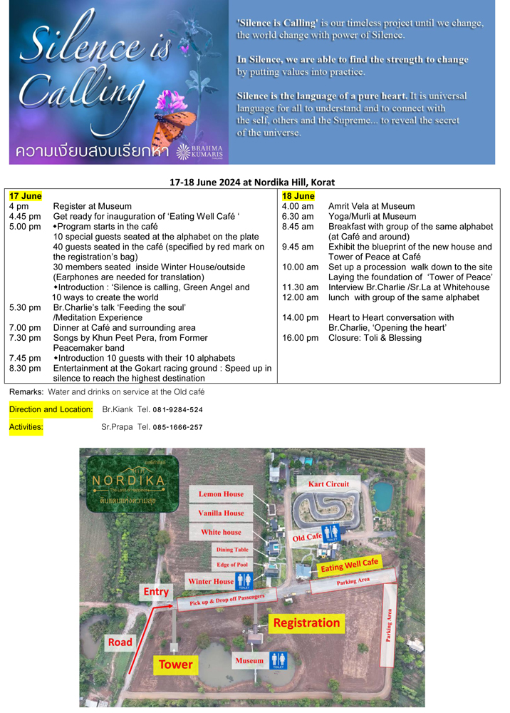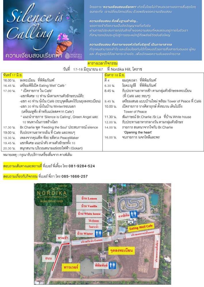 บันทึก VDO ขึ้น Youtube: ผู้จัดรายการ จาก CEO ซี้ปึ้ก ได้สัมภาษณ์ Br.Charlie ผู้ประสานงาน บราห์มา กุมารี ประจำภูมิภาคเอเชีย แปซิฟิก และ Sr.La (สไบทิพย์ ศิริรัตน์ธำรงค์) ผู้ประสานงานในประเทศไทย และคุณปู(ผุสดี วังฆนานนท์) เจ้าของธุรกิจส่วนตัว และ Nordika Hill แห่งนี้ บันทึกความรู้สึกที่ให้แรงบันดาลใจตลอดไป คลิกฟังเสียง พี่หญิง+พี่นิ +พี่โบว์ลิ่ง+พี่แดง+พี่ภา |