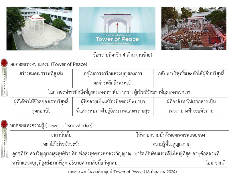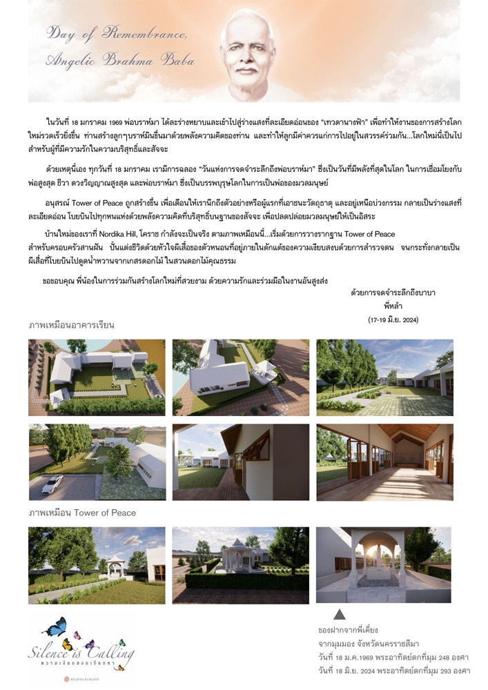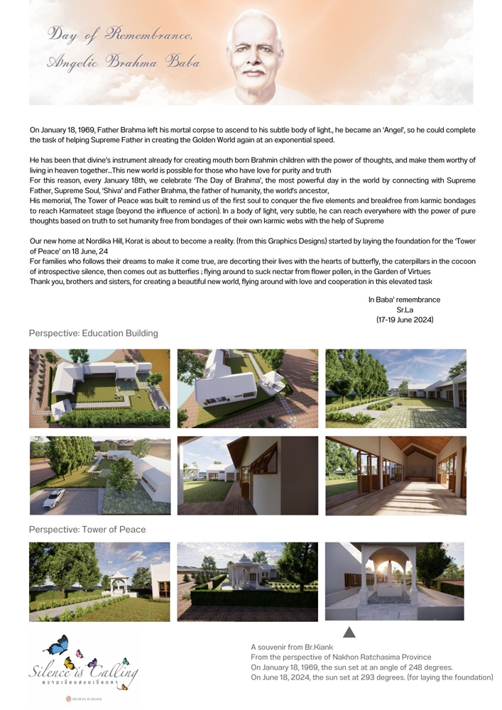 จดหมายจากพี่หล้าถึงทุกท่าน เน้นความสำคัญของ Tower of Peace และความเป็นมาที่มี Brahma Baba นำทางชีวิต