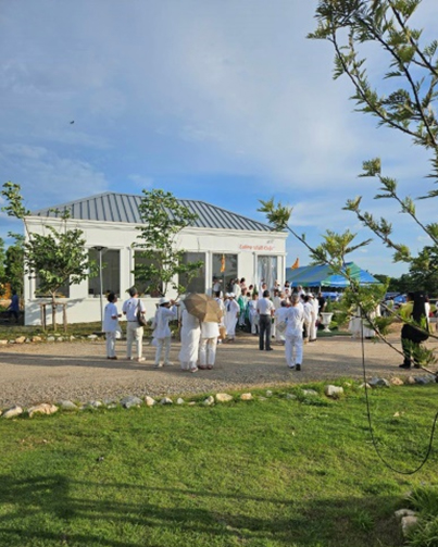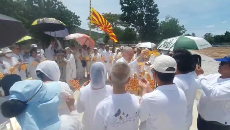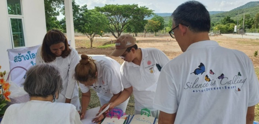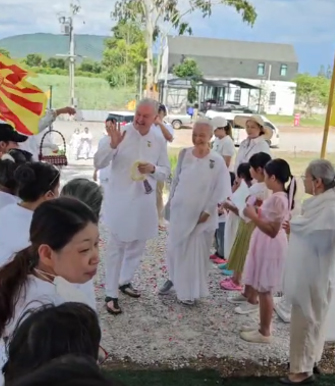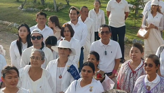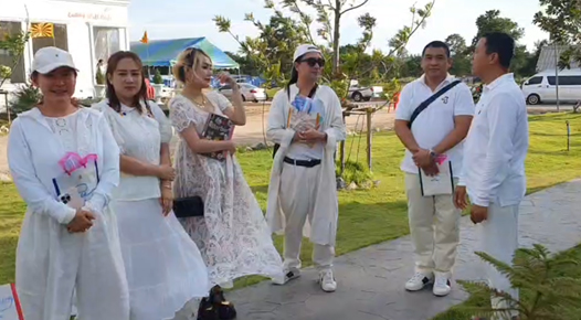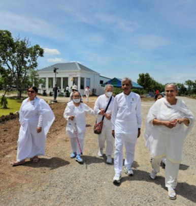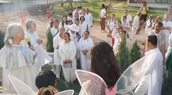ขบวนออกจาก Eating Well Café ด้วยใบหน้ายิ้มแย้มมีความ สุข มุ่งสู่ พิธีวางศิลาฤกษ์ Tower of Peace