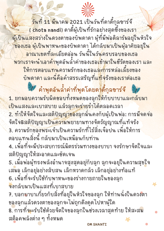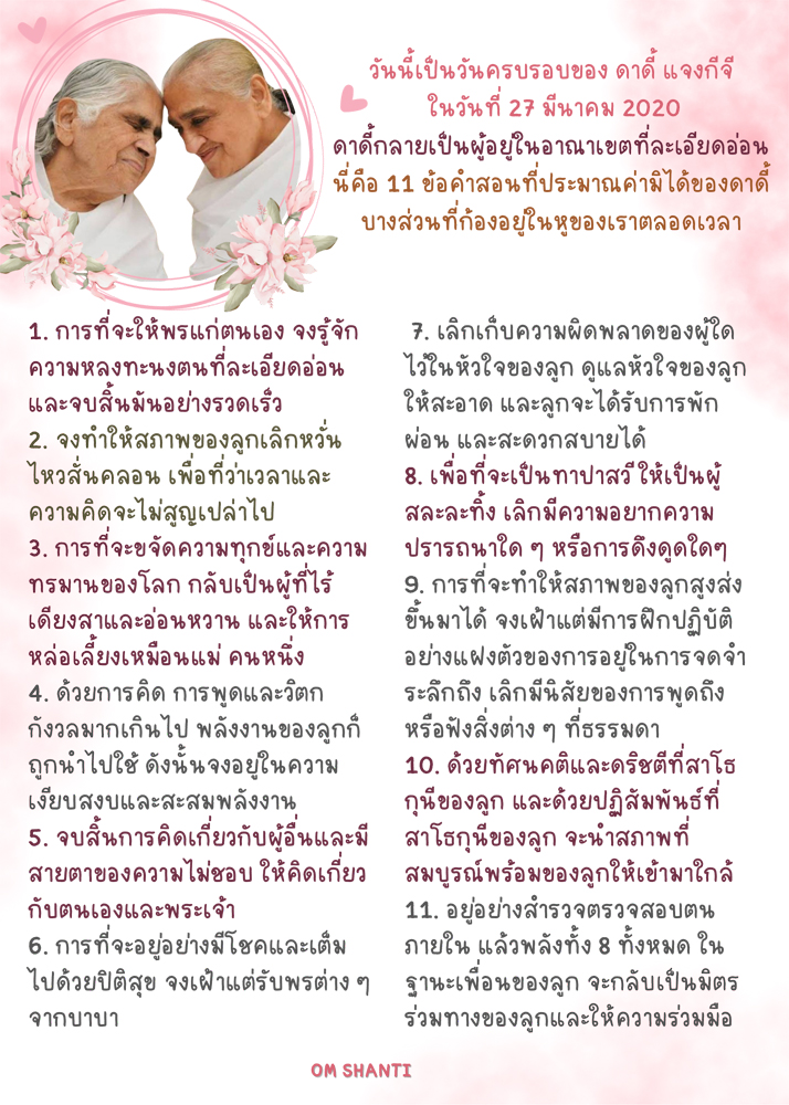 บันทึกเสียงของดาดี้ถึง Sr.La นั้นกลายเป็นเสียงอมตะ... ในการนำไปปฏิบัติได้จริงในที่สุด คำว่า ซื่อสัตย์นั้นศักดิ์สิทธิ์สำหรับชีวิตของผู้เป็นพยานในการอยู่ตั้งแต่ต้นจนจบของวงจรละครโลก Om Shanti Om Shanti Om Shanti La Hello, Sr. La , Reading your email, each word was filled with truth and love. With an honest heart that you have attained love and it is through this love that you have served Thailand . You have done very good service and keeping a balance of love and law, with love you're serving the whole country. It is great benefit in serving with unconditional love and selfless love. I believe that your mother is still alive. Please do give her my love and remembrances, Reading your email, my heart feels that I want to meet you personally. Is it possible for you to come to Madhuban to have this sweet meeting and to take this chance? Sister, I like you keep balance of being loving and detached. This is why you are such an example of being simple but an example. Some say take law is not a good thing, but one should be filled with a lot of love, is it right, sister?. You are wonderful Reading your email your face came in front of me . The words you wrote with so much bhavna were very sweet OK, Om Shanti, Good night. เพื่อสัมผัสกระแสแห่งรักและศรัทธาต่อสัจจะ... ขณะที่ขอรับฟังเสียงดาดี้ พี่ภารีบแปลไทยให้พี่น้องเข้าใจ โอม ชานติ โอม ชานติ โอม ชานติ หล้า สวัสดี หล้า เมื่ออ่านอีเมลของเธอ แต่ละคำพูดเต็มไปด้วยสัจจะและความรัก ด้วยหัวใจที่ซื่อสัตย์ ที่เธอได้รับความรัก และด้วยความรักนี้ที่เธอได้รับใช้ประเทศไทย เธอได้ทำงานรับใช้ที่ดีมากและรักษาสมดุลของความรักและความถูกต้อง ด้วยความรักเธอกำลังรับใช้ทั่วทั้งประเทศ เป็นคุณประโยชน์อันยิ่งใหญ่ในการรับใช้ด้วยความรักที่ไม่มีเงื่อนไข ความรักที่ปราศจากความเห็นแก่ตัว ฉันเชื่อว่าแม่เจ้าของเธอนั้นยังคงมีชีวิตอยู่ โปรดส่งความรักและการจดจำระลึกถึงของฉันให้กับท่านด้วย เมื่ออ่านอีเมลของเธอ หัวใจของดาดี้รู้สึกว่าต้องการพบเธอเป็นการส่วนตัว เป็นไปได้ไหมที่เธอจะมาที่มธุบันเพื่อการพบปะที่แสนหวานและเพื่อถือโอกาสนี้ ฉันต้องการให้เธอรักษาสมดุลที่ดีของการอยู่อย่างมีความรักและละวาง เหตุนี้เอง เธอเป็นตัวอย่าง ของการอยู่อย่างเรียบง่าย แต่เป็นตัวอย่าง บางคนพูดว่าการถือกฎนั้นไม่ดี ผู้นั้นควรเต็มไปด้วยความรักอันมากมาย ถูกต้องไหม ซิสเตอร์ เธอน่าอัศจรรย์ เมื่ออ่านอีเมลของเธอใบหน้าของเธอมาอยู่เบื้องหน้าดาดี้ คำที่เธอเขียนเต็มไปด้วยภาวนาอย่างมาก และ อ่อนหวานอย่างยิ่ง โอเค โอม ชานติ Good Night Sr.La จึงเขียนจดหมายจากใจถึงดาดี้ทันทีเช่นกัน เพื่อยืนยันการสื่อสารที่แท้จริงได้ทุกขณะ ก่อนส่งไปให้ 'แม่เจ้า' ผ่านพี่สาว Thank you Dadi,sweet powerful love of your will sustain me till my last breath as an instrument of love for Truth, a Living Truth -God-Baba. It was 4 years ago,you left your mortal coin to open our third ears to hear the voice of truth through your unlimited wisdom which has been sustaining the whole world for all walks of life. I have to send your voice to my mother...bedridden at her 99 years old in Chiangmai.Let our love for God ,spreading to humanity according to our duty as an angel to bridge between humanity and God,....Time and Eternity. Dadi ,the whole world was with you so did I.yesterday in your memorial day. กระแสจิตในถ้อยคำนี้ ได้เปิดประตูใจของญาติมิตรซึ่งมีการตอบรับกลับมา เริ่มจากพี่ปุ๋ย (ภรรยาพี่จ้ะ - พ