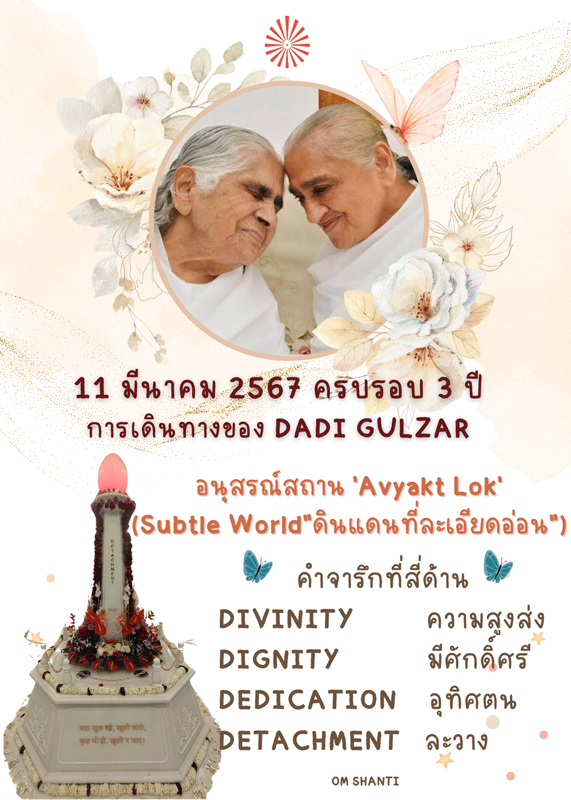 เรามีโอกาสระลึกถึงคุณค่าความดีอันมีผลต่อการสร้างโลกใหม่ของ Dadi Gulzar(11 มี.ค.) และ Dadi Janki(27 มี.ค.) ในวันที่ท่านทั้งสองละร่างไป จึงทิ้งอนุสรณ์สถานไว้ในมธุบัน พร้อมทั้งคำสอนของท่าน ให้บันทึกไว้ในหัวใจเราทุกคน (สรุปจากมูร์ลีในวันระลึกถึงท่าน) Dadi Gulzar 11 มีนาคม 2567