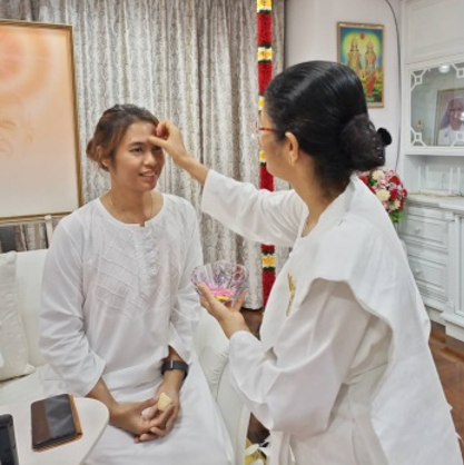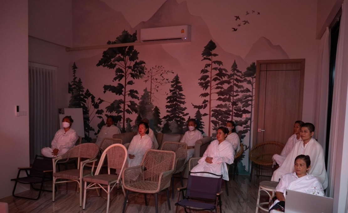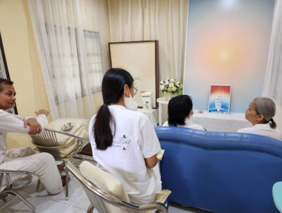ขอบคุณแม่ปุ้มในการจัดแต่งสถานที่ ให้เข้ากับบรรยากาศ สีฟ้าแห่งความสงบเสริมคุณสมบัติของแม่ผู้หล่อเลี้ยงอย่างไม่มีขีดจำกัด รถบ้านมีโฆษณาติดรถ ‘Silence is Calling’ ความเงียบสงบเรียกหา จอดอยู่หน้าบ้าน เพื่อเชิญชวนเข้ามาทำสมาธิกัน ในวันฉลองการอวตารของแสงทิพย์ เรียกว่า ชีพราตรี หรือ ศิวราตรี