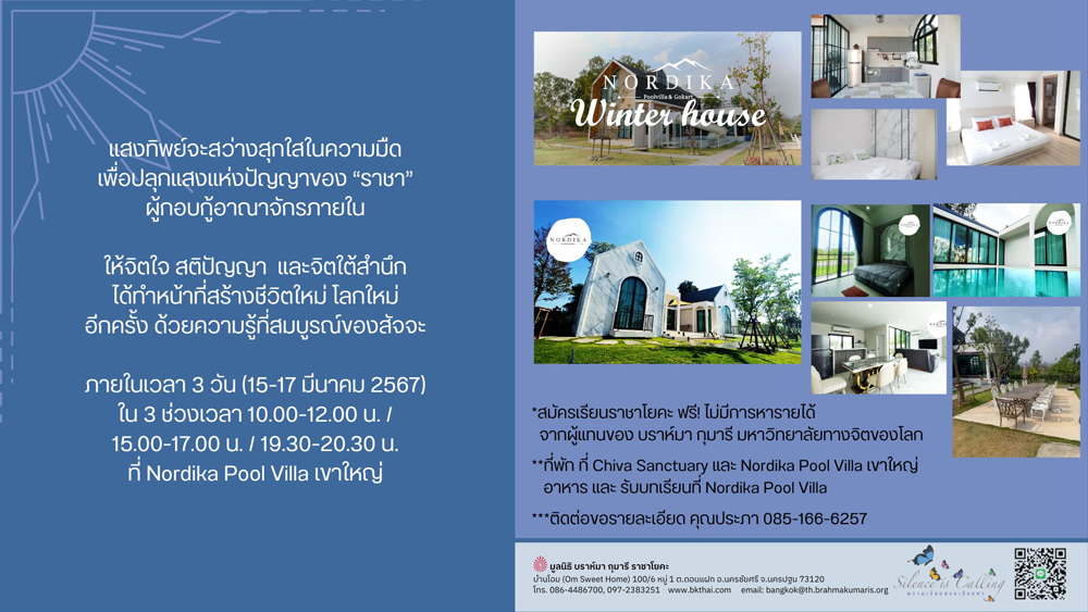 พี่หล้าได้ตอบรับทราบถึงเจตนาของพี่ปูตามบันทึกเสียง (คลิกฟังเสียง) ที่เล่าที่มา...ของการมอบที่ดินนี้ “ยอดเยี่ยมจริงๆกับสิ่งที่หนูแจงจากใจที่ใสสะอาดและซื่อสัตย์กับความสัมพันธ์ของเราที่จะทำให้เข้าถึงหัวใจของบาบา ในการมอบความรักให้แก่ลูกรักของท่านตามสมญาที่หนูได้ ติดผ้าขาวไปนะคะ เพราะเป็นสมญาที่สร้างความถ่อมตนตามใจปรารถนาในบัตรคุณธรรมแรกพบของเรา เราไม่ได้ ต้องเป็นอะไรที่ใครเห็นยิ่งใหญ่มากไปกว่าเป็นลูกของบาบาที่นั่งบัลลังค์หัวใจท่าน ทุกถ้อยคำของหนูกำลังแสดงให้ปัญญาในเนื้อแท้” 13 มี.ค. Sr.La และทีมงานกลุ่มแรกจากบ้านโอม นครปฐม เดินทางถึง Nordika โคราช เพื่อตั้งหลัก เตรียมสถานที่ และความพร้อมสำหรับการรับบทเรียนราชาโยคะ 14 มี.ค. คณะทำงานตามมาสมทบ เช้า-บ่าย ตอนเย็นจึงอยู่กันพร้อมหน้ากับครอบครัวเจ้าของสถานที่