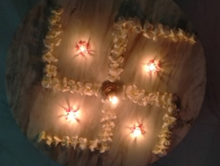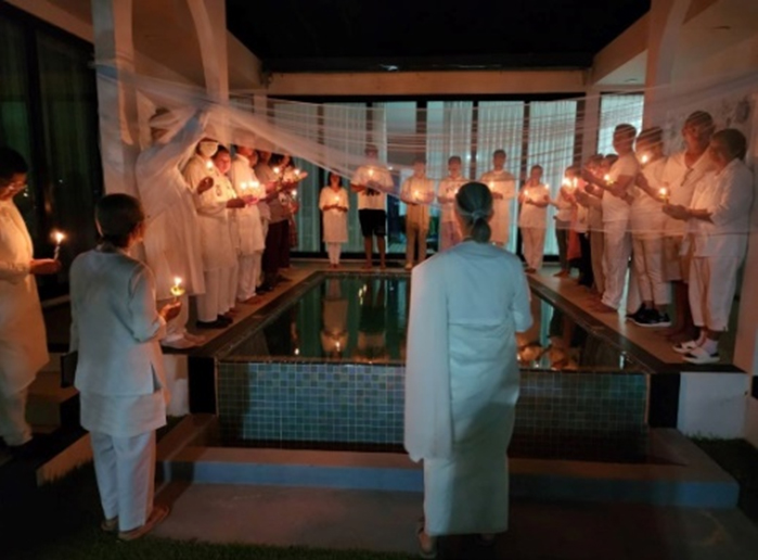 หลังอาหารเย็นร่วมจุดเทียน ให้แสงเรียงรายล้อมสระน้ำ แล้วสะท้อนแสงแห่งความสงบที่ได้พบกับแสงสูงสุด ท่ามกลางความมืด ในคืนวันชีวา