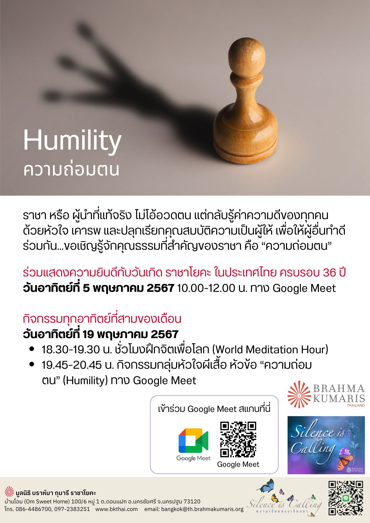(18.30-19.30 น.) และเข้าร่วมรายการหัวใจผีเสื้อ (19.45-20.30น.) หัวข้อ ความถ่อมตน (Humility)...ของราชา