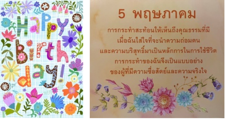 บทบาทของพี่ภา ในวันเกิดราชาโยคะ พูดถึงประวัติที่มา ของ การก่อตั้งมูลนิธิฯ...เพื่อรายงานการประชุมประจำปีเป็นทางการ มูลนิธิ บราห์มากุมารี ราชาโยคะ ก่อตั้งสำนักงานใหญ่ ณ บ้านเลขที่ 100/6 หมู่ 1 ต.ตอนแฝก อ.นครชัยศรี จ.นครปฐม มีสาขาอยู่ 3 แห่ง ที่ จ.เชียงใหม่ ปัตตานี และสมุทรปราการ วัตถุประสงค์ของมูลนิธิคือ การศึกษาความรู้ทางจิต เผยแพร่การศึกษาความรู้ทางจิตให้เกิดความเข้าใจในจิตสำนึกมนุษย์ที่ประกอบด้วย จิตใจ สติปัญญา และบุคลิกภาพ รวมทั้งเข้าถึงปรัชญาในเชิงศิลปะศาสตร์และวิทยาศาสตร์ เพื่อสร้างชีวิตที่สมบูรณ์พร้อมทั้ง 3 ด้าน กล่าวคือ (คลิกอ่านต่อ) 2.ประสบการณ์ส่วนตัว(พี่ภา)ในการเข้ามาเป็นบราห์มากุมารี ได้เกิดการตระหนักรู้ว่า ความรู้นี้เป็นไปสำหรับทุกคน การตัดกิเลส การสร้างสมคุณธรรมเป็นเรื่องของทุกคน ไม่ว่าเด็กหรือผู้ใหญ่ ไม่ว่าจะอยู่ในวัยใด ไม่ใช่เรื่องของพระหรือนักบวชเท่านั้น ที่จะต้องกำจัดกิเลส สร้างสมคุณธรรม รับใช้ช่วยเหลือสังคมและโลก แต่เป็นเรื่องของทุกชีวิตที่จะต้องทำให้ตัวเองได้หลุดพ้นจากปัญหา และพาตนเองให้รอดพันจากความหายนะ ทั้งส่วนบุคคลและส่วนรวม และเวลานี้ผู้เป็นใหญ่สูงสุดได้มาและชี้หนทางแก้ไข หนทางที่จะทำให้ชีวิตเจริญรุ่งเรือง โดยการใช้ทุกสิ่งอย่างมีค่า เป็นฤดูกาลของการที่ต้องเพาะเมล็ดเพื่อที่จะได้เก็บเกี่ยวผล ตามเวลา ฤดูกาล ได้ ดิฉันได้เห็นการพัฒนาเผยแพร่ราชาโยคะในประเทศไทยตั้งแต่เริ่มต้นที่ถนนพัฒนาการ ย้ายมาที่ถนนแจ้งวัฒนะ และที่นครปฐม ที่บ้านโอม ได้มีโอกาสอยู่กับศูนย์ และได้ทำ สิ่งที่ช่วยให้เกิดความก้าวหน้าอย่างรวดเร็ว 5 สิ่ง อมฤตเวลา, มูร์ลี, ออฟเฟอร์โบ๊ค, Traffic control, และโยคะเย็น ทำให้ได้ผัสความรักและพลังจากพระเจ้าจากบาบา ชีวิตมีหนทางแก้ไขปัญหา มีความอดทน เคารพตนเอง รู้ค่ารู้คุณของทุกสิ่งทุกคน รู้สึกเบาสบายและปลอดภัย อยู่ในกรอบอยู่ในขอบเขตในการหล่อเลี้ยงของบาบา และที่สำคัญที่สุด ได้เห็นพลังของความบริสุทธิ์ของครอบครัว ที่ดึงดูดคนที่ดีๆ ที่สำเร็จรูปเข้ามา เราก็จะมีการตั้งหลักปักฐานที่จะรับใช้ทั่วทั้งแผ่นดินที่นครราชสีมา ขอแสดงความยินดีกับบาบาอย่างอย่างสุดซึ้ง แล้วก็ปวารณาตนเองว่าจะช่วยเหลือ ว่าจะอยู่ในงานรับใช้ตลอดไป 3.คุณธรรมสดชื่นแจ่มใส –ประจำเดือนพฤษภาคม ซึ่งตรงกันกับอีก 3 คน พี่แดง + พี่นิ จึงนัดหมายกันใช้เพลง I am on my way มั่นใจที่บาบารับประกันว่า จะมาเปลี่ยนชีวิตให้เป็นดอกไม้ และพากลับบ้าน เวลานี้ ฉันจึงจับมือบาบาเดินอยู่ในส่วนดอกไม้แห่งคุณธรรม ทุกวันจึ