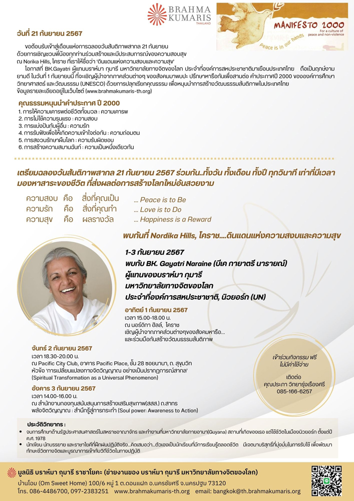 เราต้อนรับ Sr. Gayatri สู่ประเทศไทยด้วยสามรายการสำหรับประชาชน ระหว่างวันที่ 1-4 กันยายน 2024 เพื่อเตรียมเฉลิมฉลองเดือนสันติภาพสากล (21 กันยายน 2567)