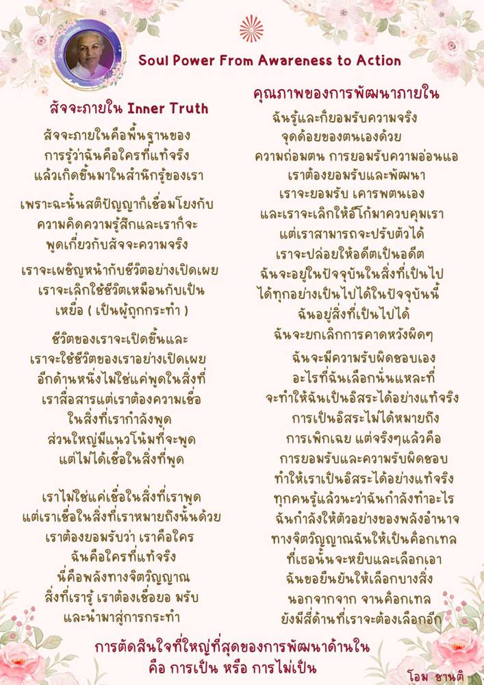 - ความรักอันลึกซึ้งต่อสิ่งสูงสุดจะเกิดขึ้นได้ก็ต่อเมื่อเราเข้าใจบทบาทและความรับผิดชอบของท่านอย่างถูกต้อง และรักดวงวิญญาณแรก บราห์มา บาบา ผู้วางรอยเท้าให้เราเดินตามไปอย่างไม่มีเงื่อนไข