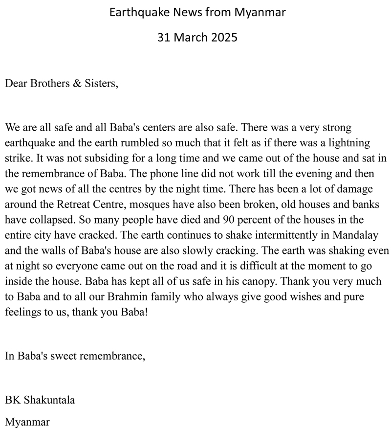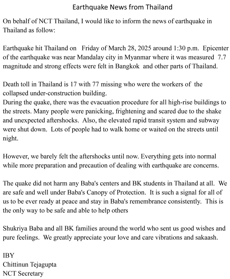 Sister Chittinun, can you draft a message on behalf of the Thai NCT to send to the International rosary about the news of earthquake in Bangkok. If you can draft as soon as possible and first send to the NCT for approval and then to Maureen and Kim in London to send to the world. Everyone is asking how you are. จากอินเดีย Dear All, Karunabhaiji and Asha Didi (ORC) called to ask about Earthquake here and conveyed message to all...be safe with Baba and take care.(แหง่ม) Om Shanti. Received voice message from Asha Didi. It is in Hindi hence not posting here. Got call from Suraj bhai and others from Madhuban asking for Baba’s children in view of earthquake today afternoon. Thanks. (Br.Kairash) Video call from Brijmohanbhaisaab waving hand to all BKs in Thailand after knowing about earthquake here...We r so lucky in Brahmabhumi which is part of Bharat.(แหง่ม) จาก Muritius, Australia Turkey รวมทั้ง China, Vietnam I read about earthquake....hope all ok Dear Sister La How’s everything there ? Hope all Baba’s children are fine. Sending Sakash with good wishes Hope you are all safe and sound in Baba's canopy 🙏🏻🙏🏻🙏🏻