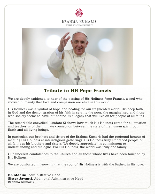25 เม.ย. บันทึกเสียง... พี่ภาอ่านจดหมายดีดี้โมฮินีที่กล่าวถึงการจากไปของ Pope Francis + พี่หล้าอ่านสาส์น ‘พี่แดง’ญาติสายหัวใจ + พี่หนิงแสดงความรู้สึกขอบคุณบราห์มากุมารี ในฐานะชาวคริสเตียนที่มาเรียนราชาโยคะบางครั้ง และอ่านสาส์น Pope Francic ปี 2022 คลิกฟังเสียง สาส์นจากดีดี้โมฮินี (N.Y) ถึงครอบครัวทางจิตทั่วโลก คำแสดงไว้อาลัยแด่องค์สมเด็จพระสันตะปาปาฟรานซิส ผู้เป็นดวงวิญญาณที่ได้แสดงให้เห็นถึงมนุษยชาติ..ที่มีความรัก และความเมตตากรุณานั้น ยังมีอยู่ในโลกนี้