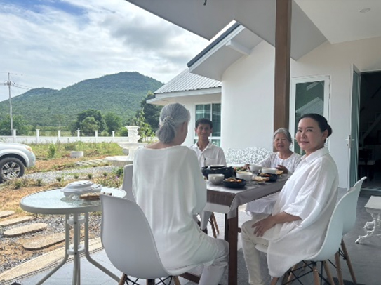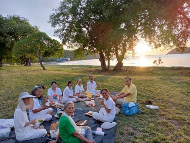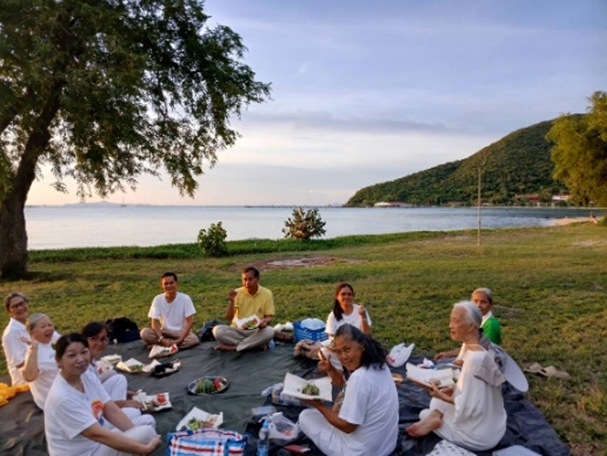 ครอบครัวทางจิตรับประทานอาหารเย็นร่วมกัน บนสนามหญ้า ใกล้ที่พัก ก่อนพระอาทิตย์ลับขอบฟ้า