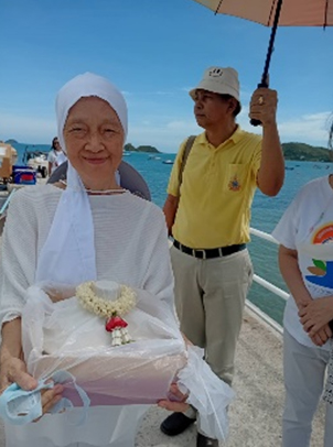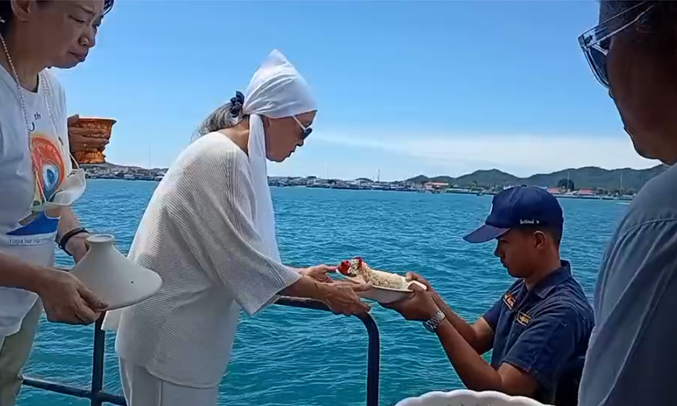ขณะที่ล่องเรือไป เจ้าหน้าที่ได้ดำเนินพิธีมีบทสวดทางศาสนา เราทุกคนร่วมใจอยู่ในความสงบเพื่อโปรยเถ้ากระดูกลงทะเล ให้มหาสมุทรกว้างใหญ่ไพศาลหลอมละลายทุกสิ่ง ของวัตถุธาตุกลับคืนสู่ธรรมชาติ