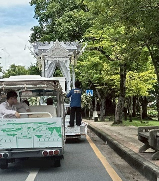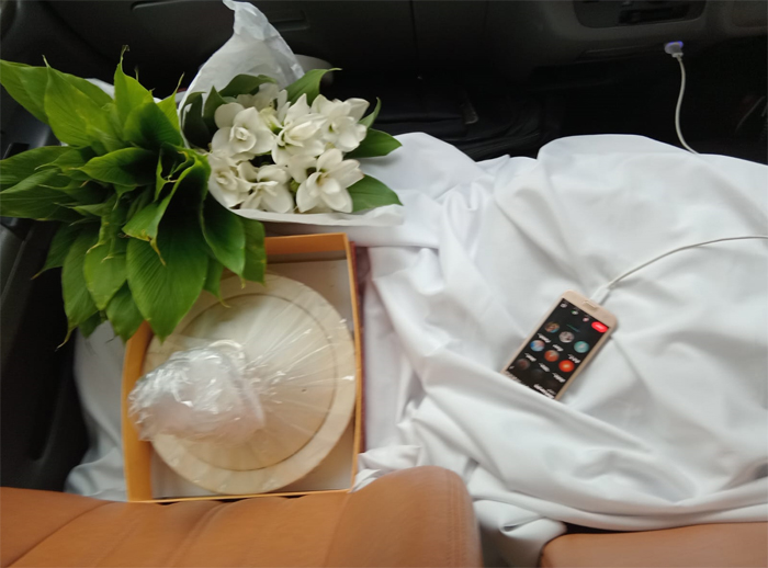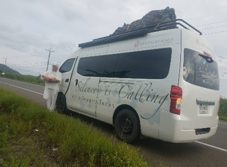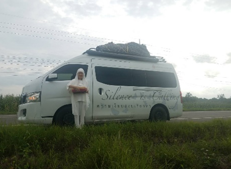 อัฐิของ ‘แม่เจ้า’ ในผอบเดินทางมาในรถตู้ ตามเสียงเรียกของความเงียบสงบ ในโครงการ ‘Silence is Calling’ โดยมีคณะทำงานใช้ Sticker เดียวกัน ติดรถ